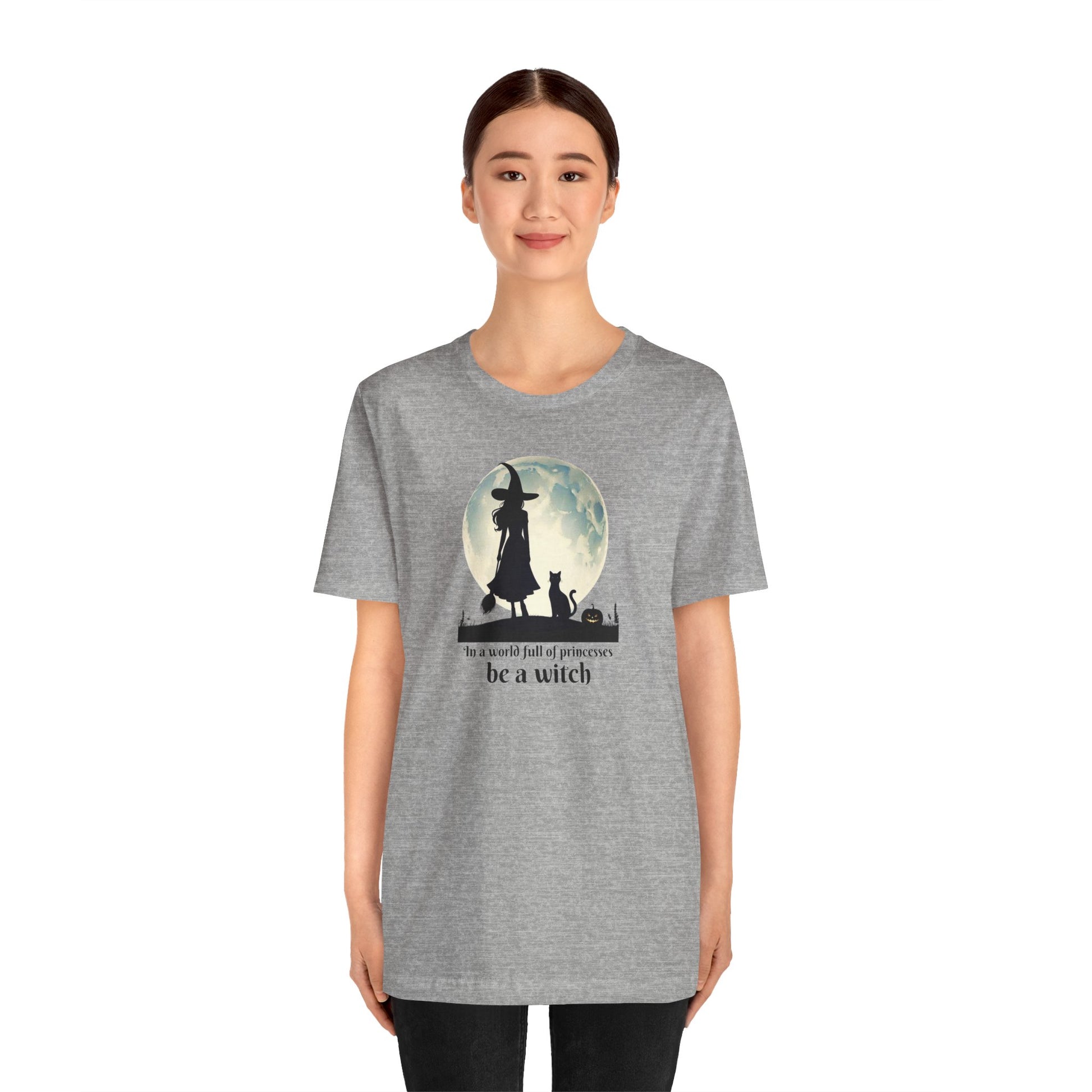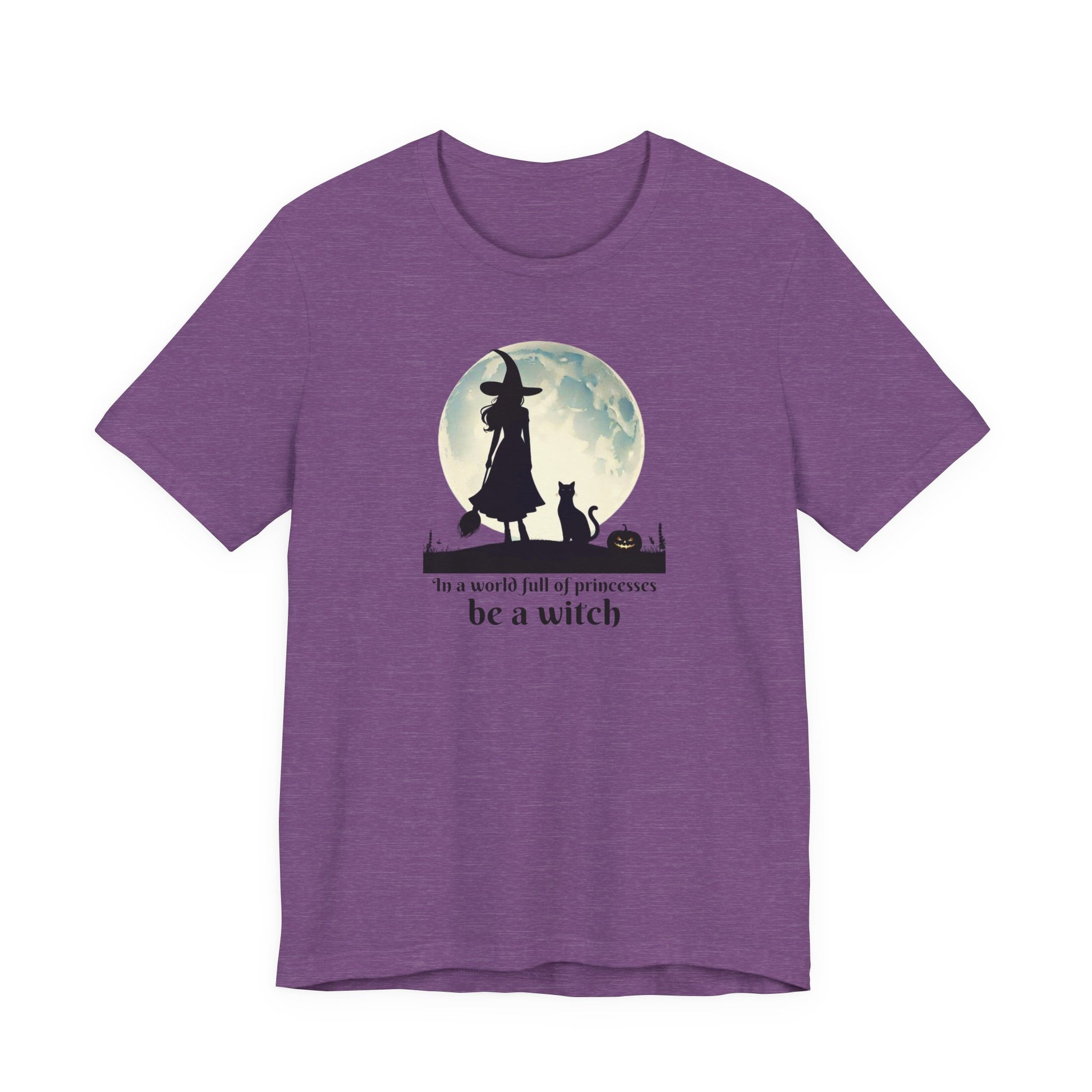 Step into your power with this striking witchy tee. Featuring the silhouette of a witch under the full moon, her loyal black cat by her side, and the glowing reminder “In a world full of princesses, be a witch” — this shirt blends mystery and empowerment.