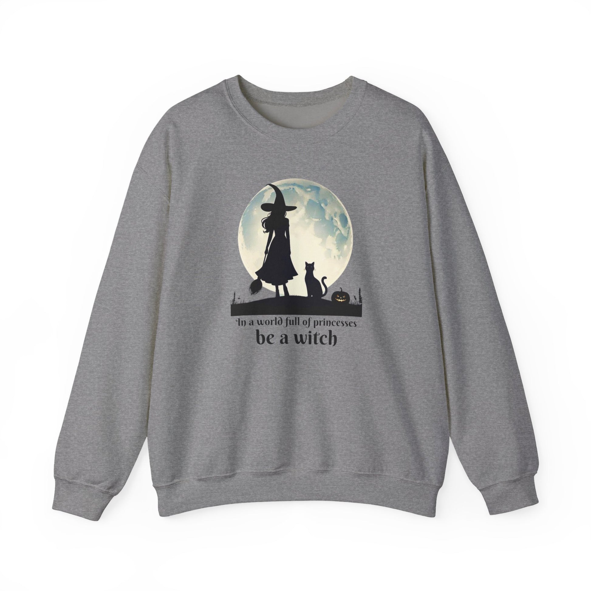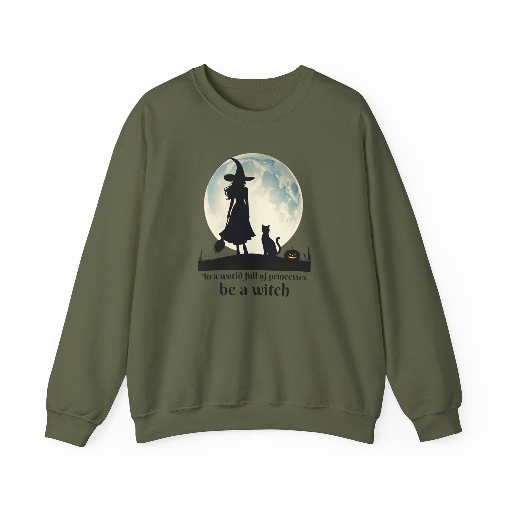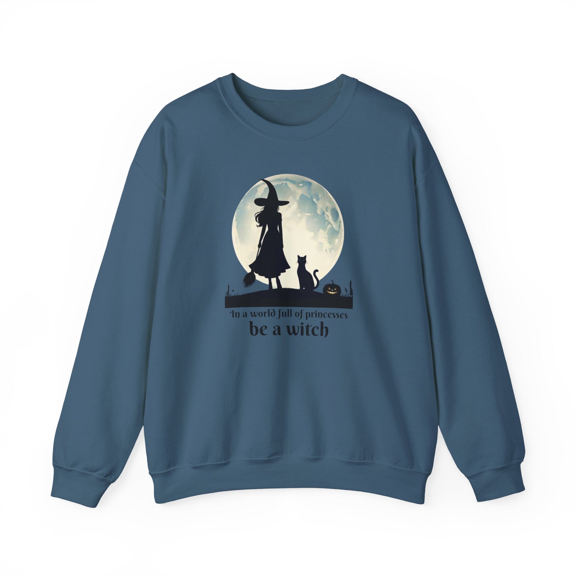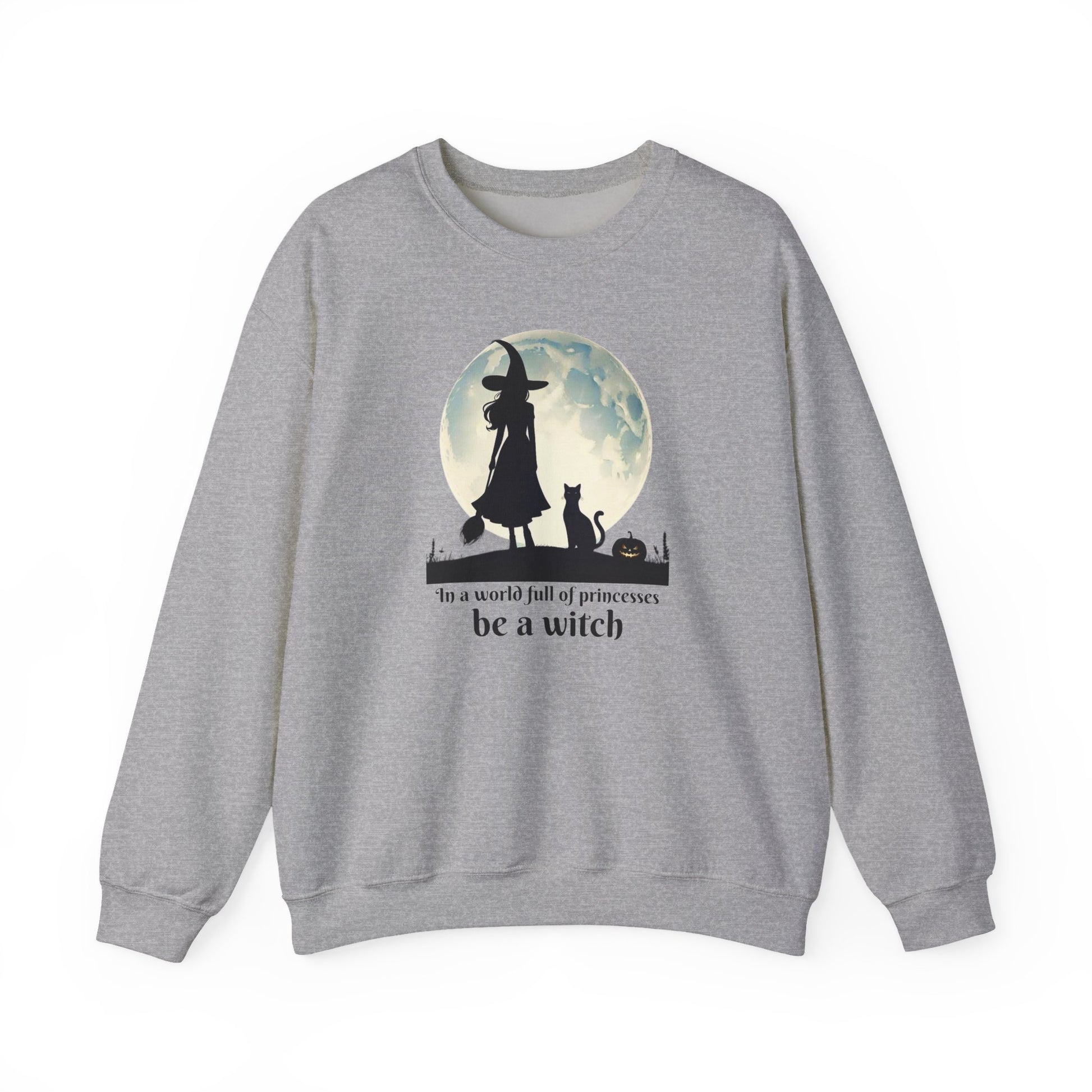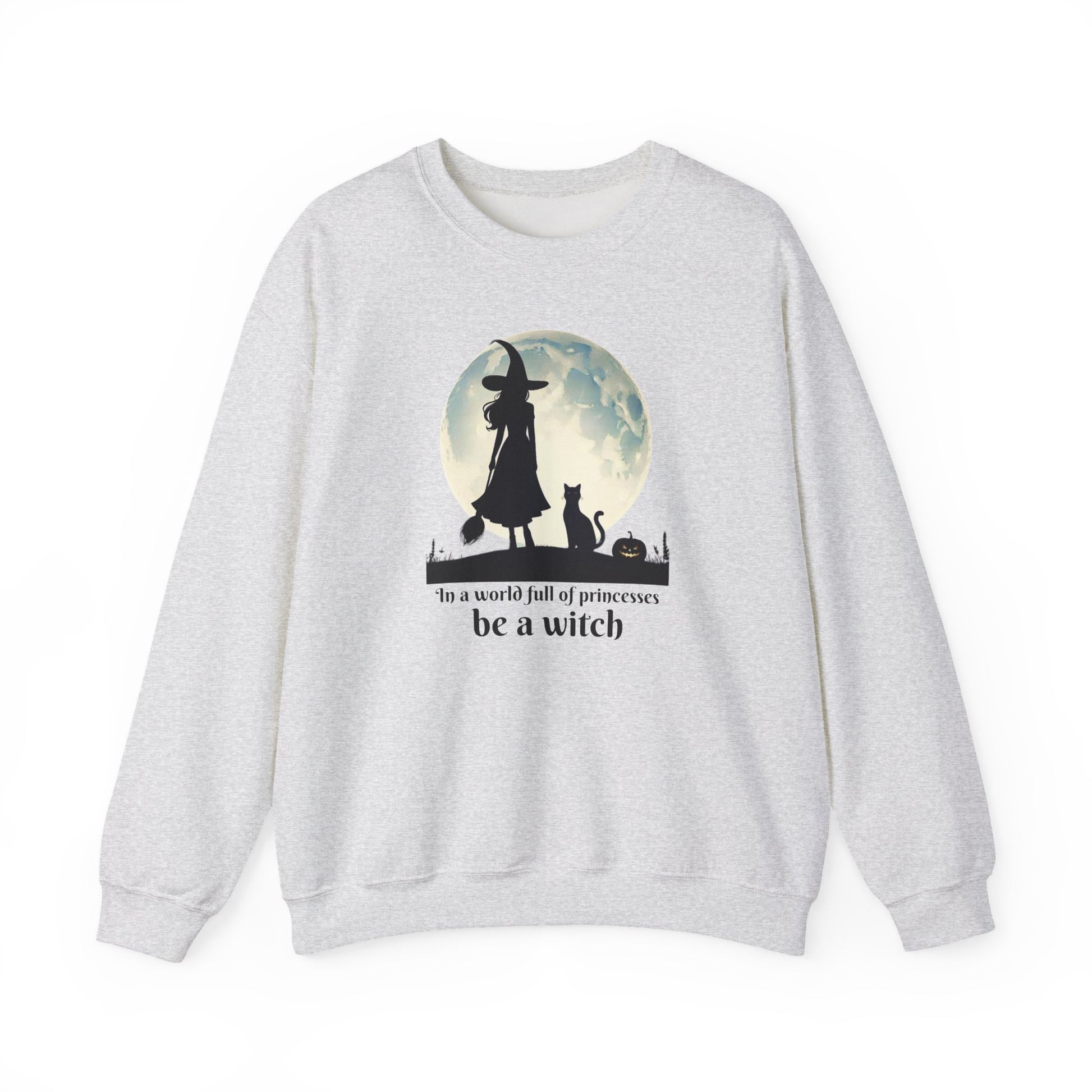 Step out of the ordinary and into your power with this Be a Witch Sweatshirt. Featuring a bold silhouette of a witch under the full moon with her loyal black cat and a glowing jack-o’-lantern, this design declares: “In a world full of princesses, be a witch.”