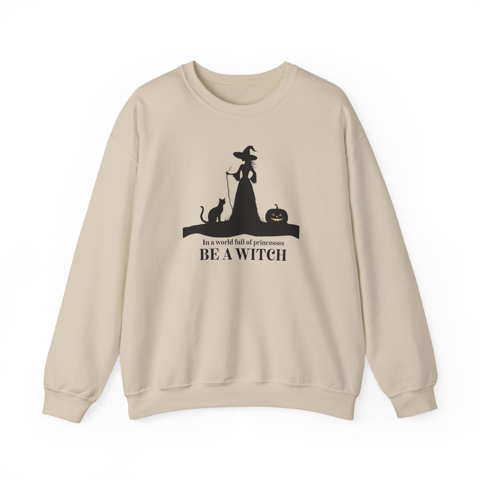 Dare to stand out with the Be a Witch sweatshirt. Featuring a gothic-inspired illustration of a witch beneath the glowing moon, alongside her black cat and pumpkins, this design carries the powerful message: “In a world full of princesses, be a witch.”