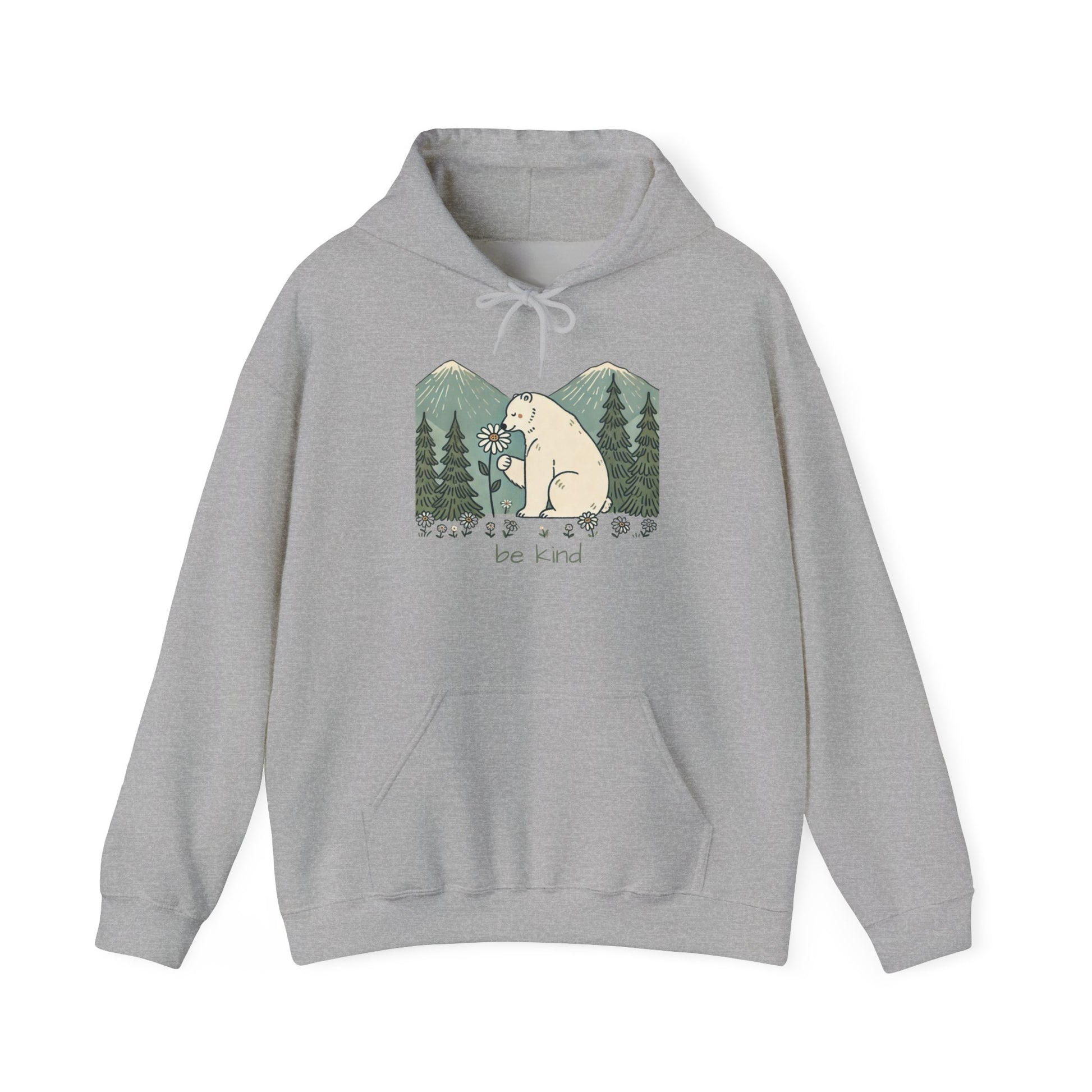 Wrap yourself in warmth and kindness with this Be Kind Polar Bear Hoodie. Featuring a gentle bear holding a daisy against a backdrop of mountains and pine trees, this design reminds us that even the strongest creatures can live with softness. Perfect for cozy nights, morning walks, or gifting to someone who inspires you with their compassion.