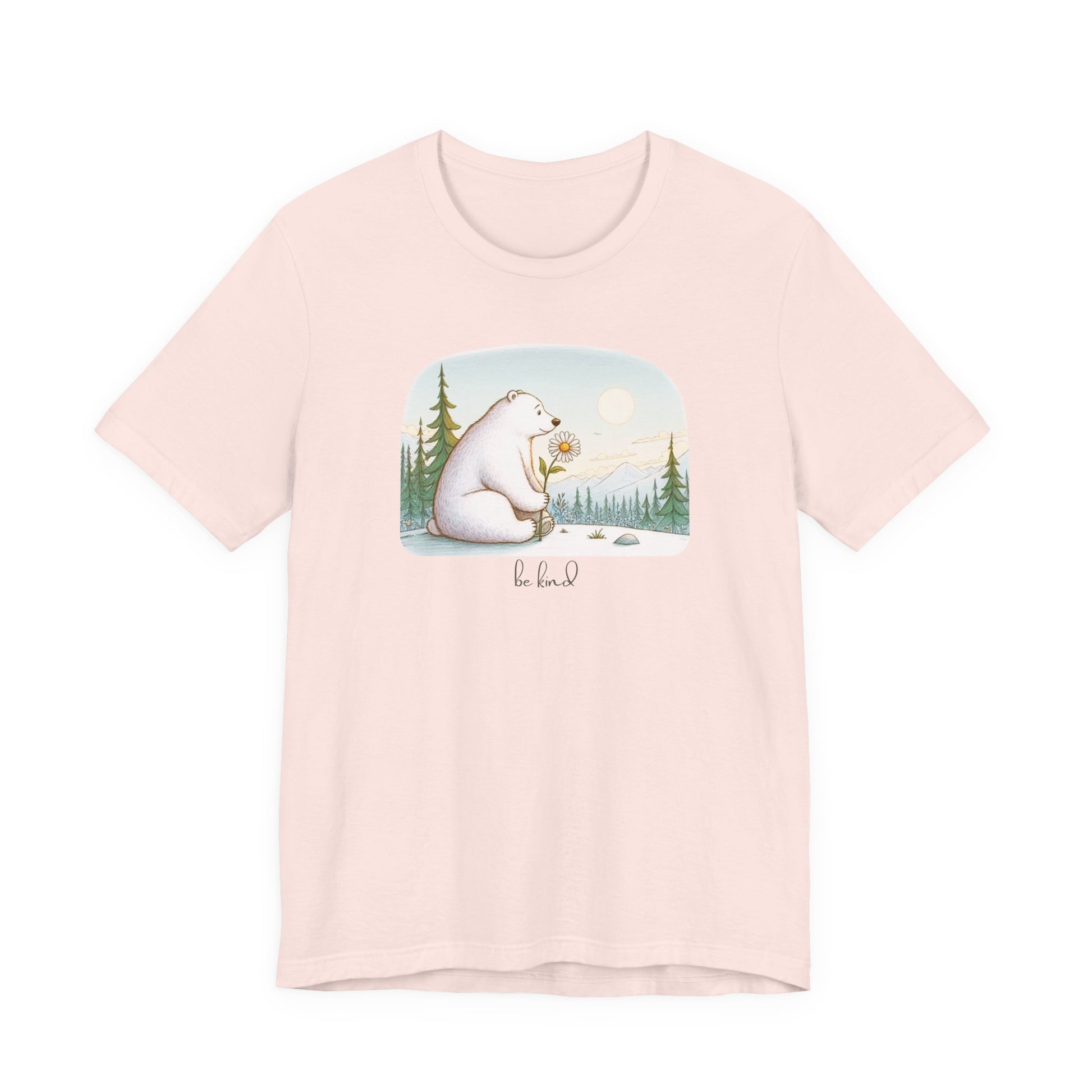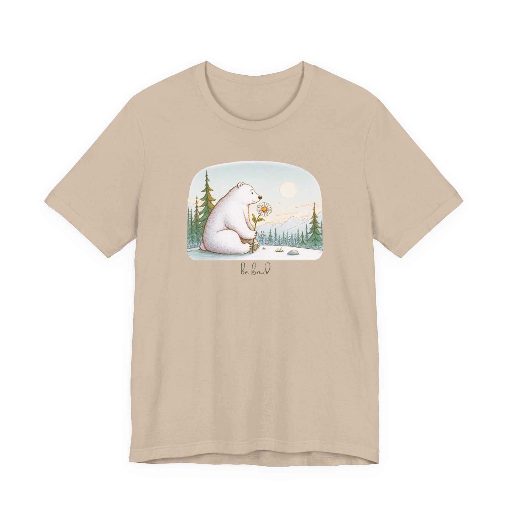 Carry a moment of mountain peace with you in our "Be Kind" Polar Bear Tee. This edition features our signature storybook illustration of a gentle polar bear pausing to admire a lone daisy in a serene, sun-drenched meadow. It is a wearable reminder that the bravest thing you can be is kind.