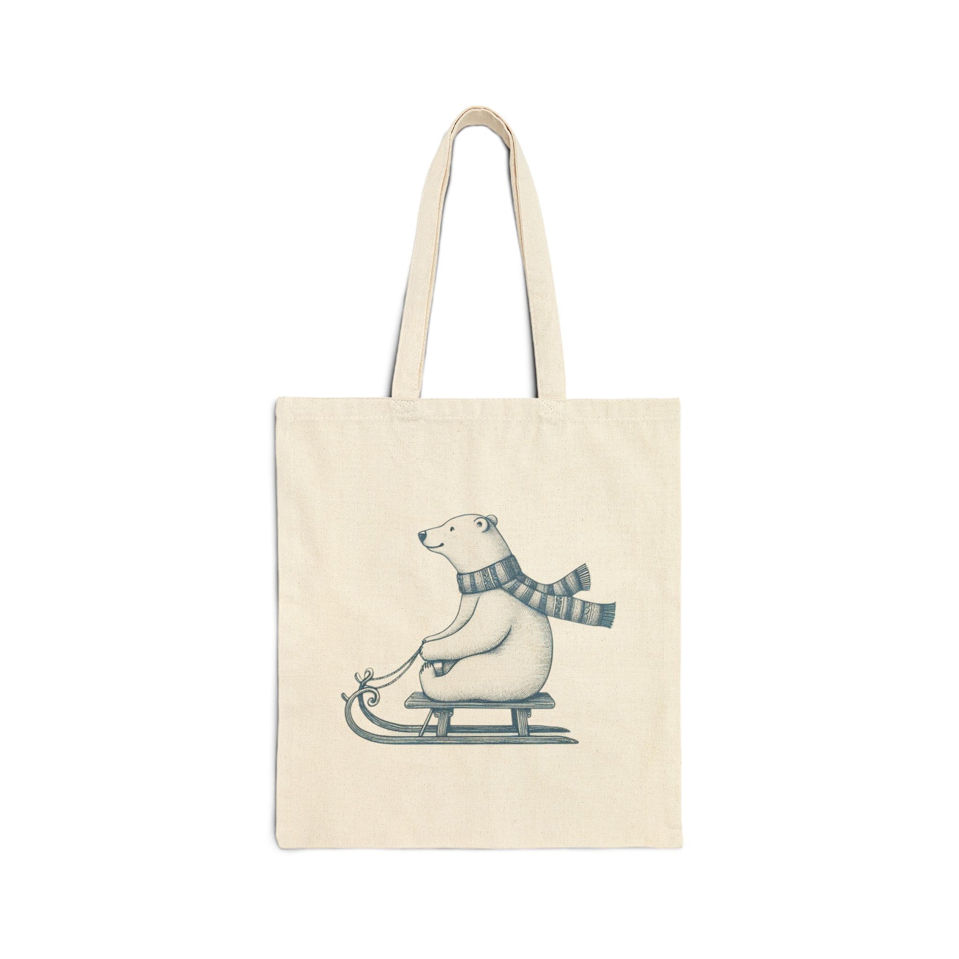 Show off your holiday spirit with this adorable polar bear tote bag. Featuring a scarf-wrapped polar bear joyfully sledding. This natural cotton canvas bag is perfect for holiday shopping, market runs, or adding festive charm to your everyday errands.