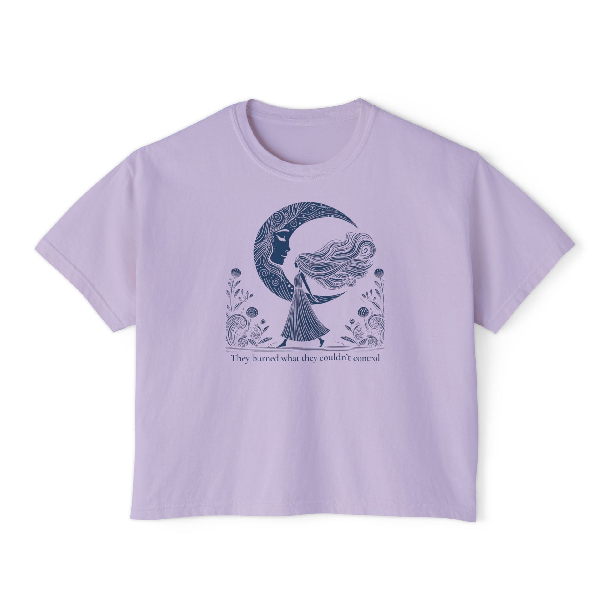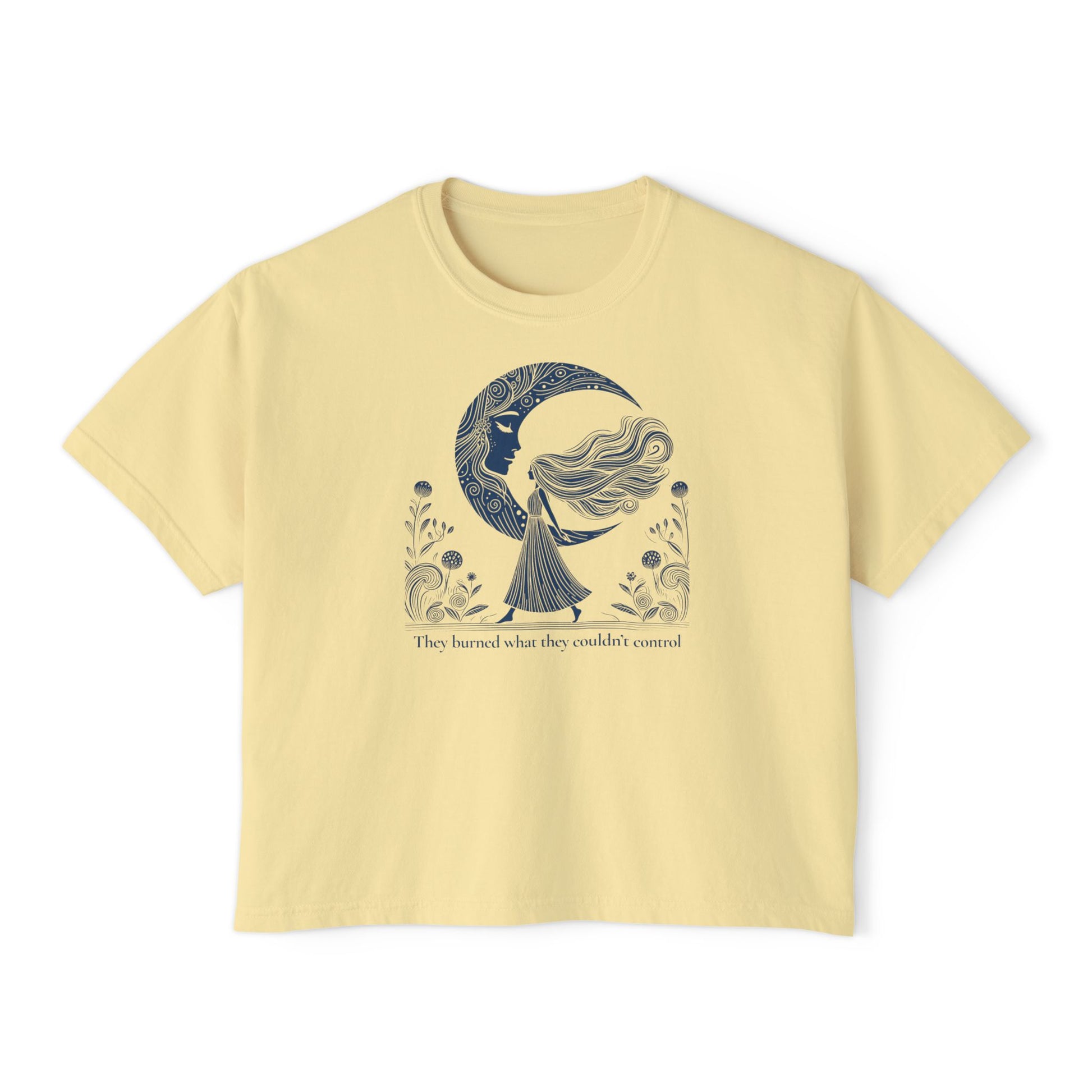 Honor the strength of those who came before with our Control & Fire Crop Tee. This striking piece features a detailed, vintage-inspired illustration of a celestial walker silhouetted against a crescent moon, paired with the defiant truth: "They burned what they couldn't control."