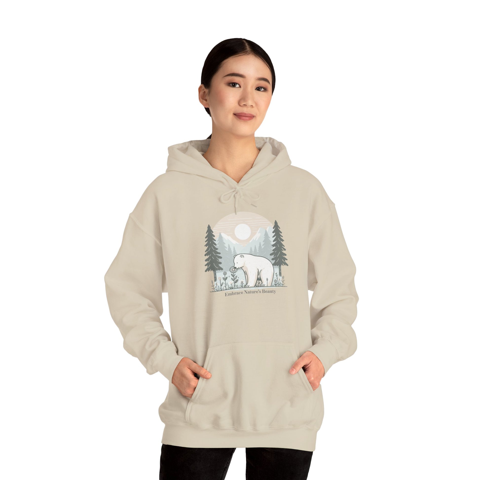 Wrap yourself in comfort and a reminder of the wilderness with this soft, nature-inspired hoodie. Featuring a peaceful bear among wildflowers beneath a glowing sun and mountain peaks, this design celebrates the gentle beauty of the natural world. Perfect for cool mornings, forest walks, or simply staying cozy at home, it’s a hoodie that invites you to carry the calm of nature wherever you go.