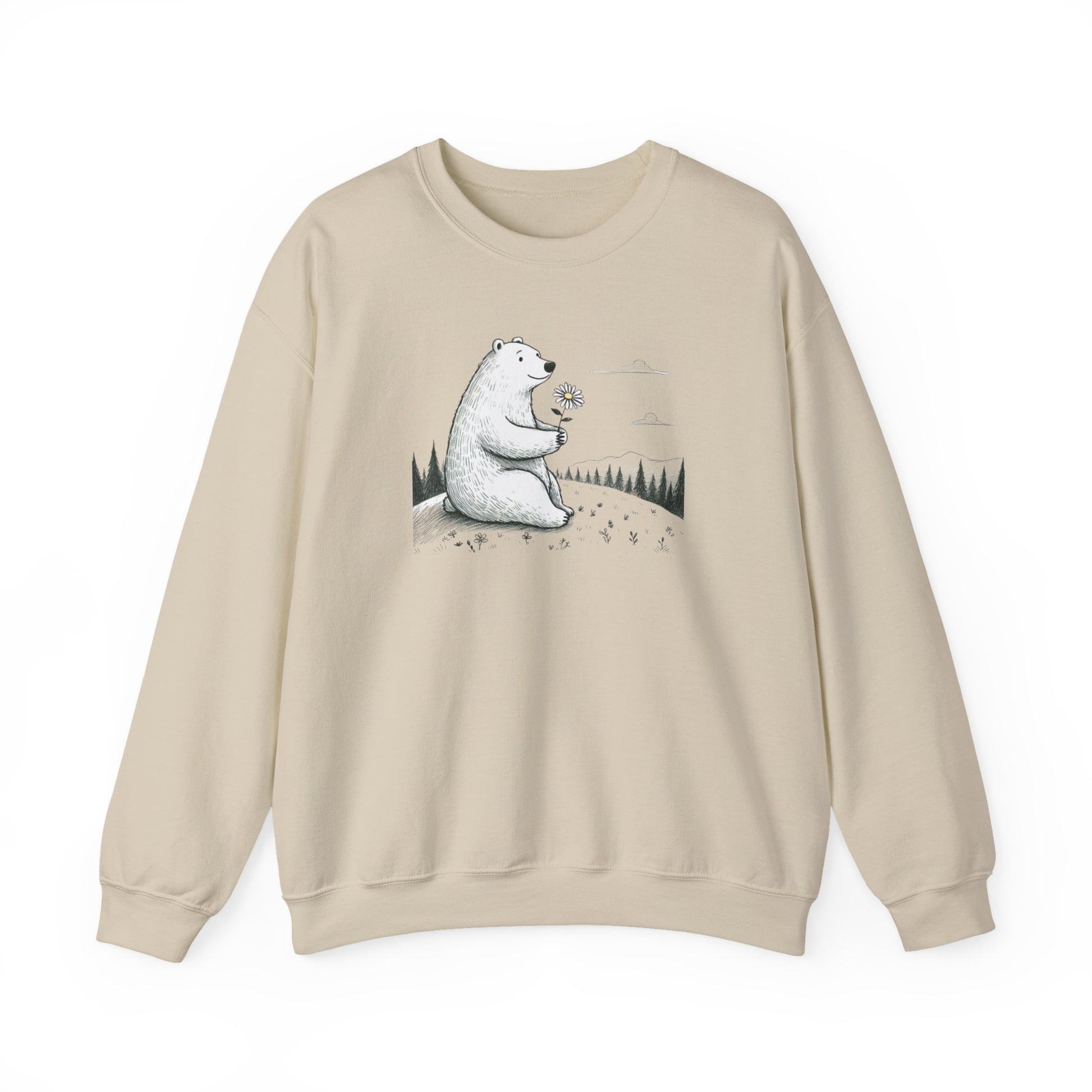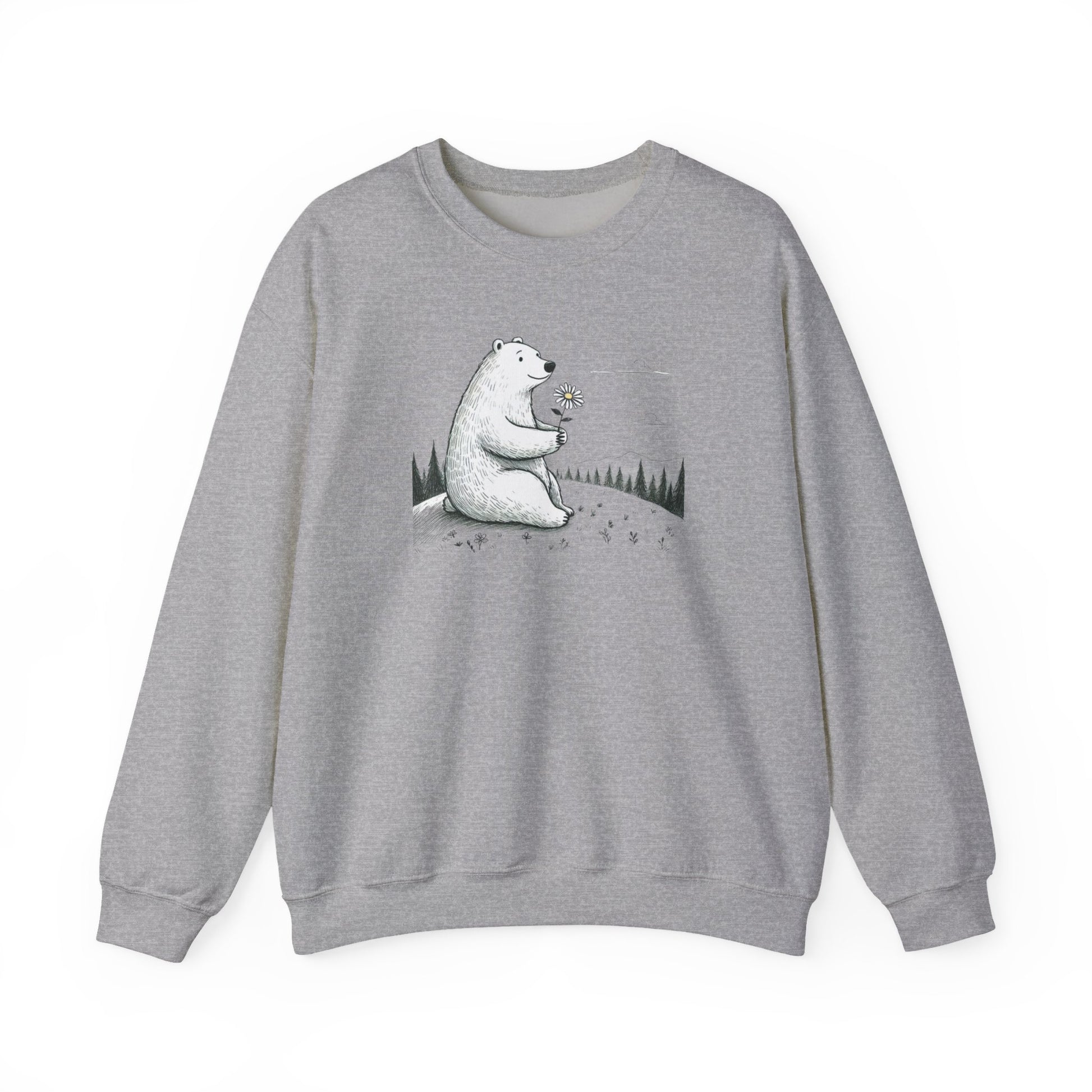 Embrace a quiet moment of nature with our Daisy Bear Sketch Sweatshirt. This refined charcoal-style illustration features a gentle polar bear among the wildflowers, bringing a soft, artisanal touch to your everyday cozy collection. Crafted from soft, heavy-blend Gildan fleece, it’s a soulful essential designed for slow mornings and peaceful mountain air.