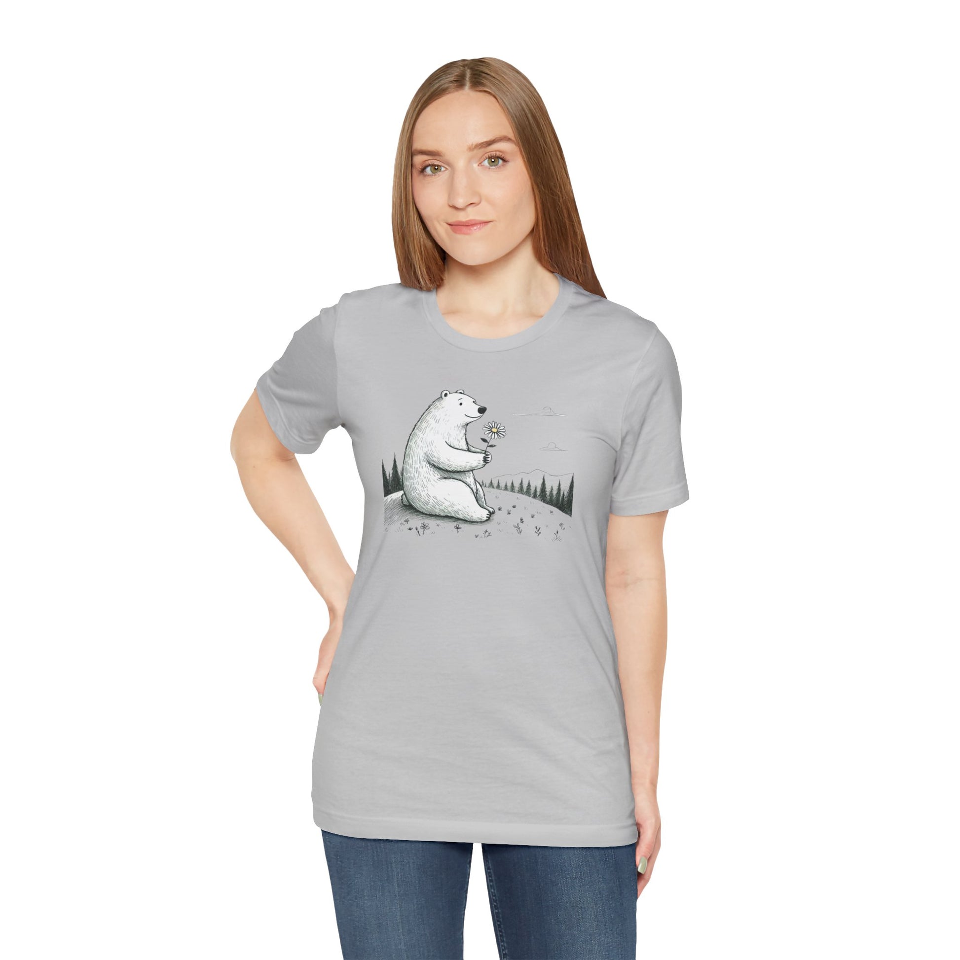 A gentle moment captured in art- this polar bear holding a daisy brings the quiet calm of nature to your everyday style. Without any words on the design, the focus stays on the hand-drawn illustration, making it versatile and timeless.