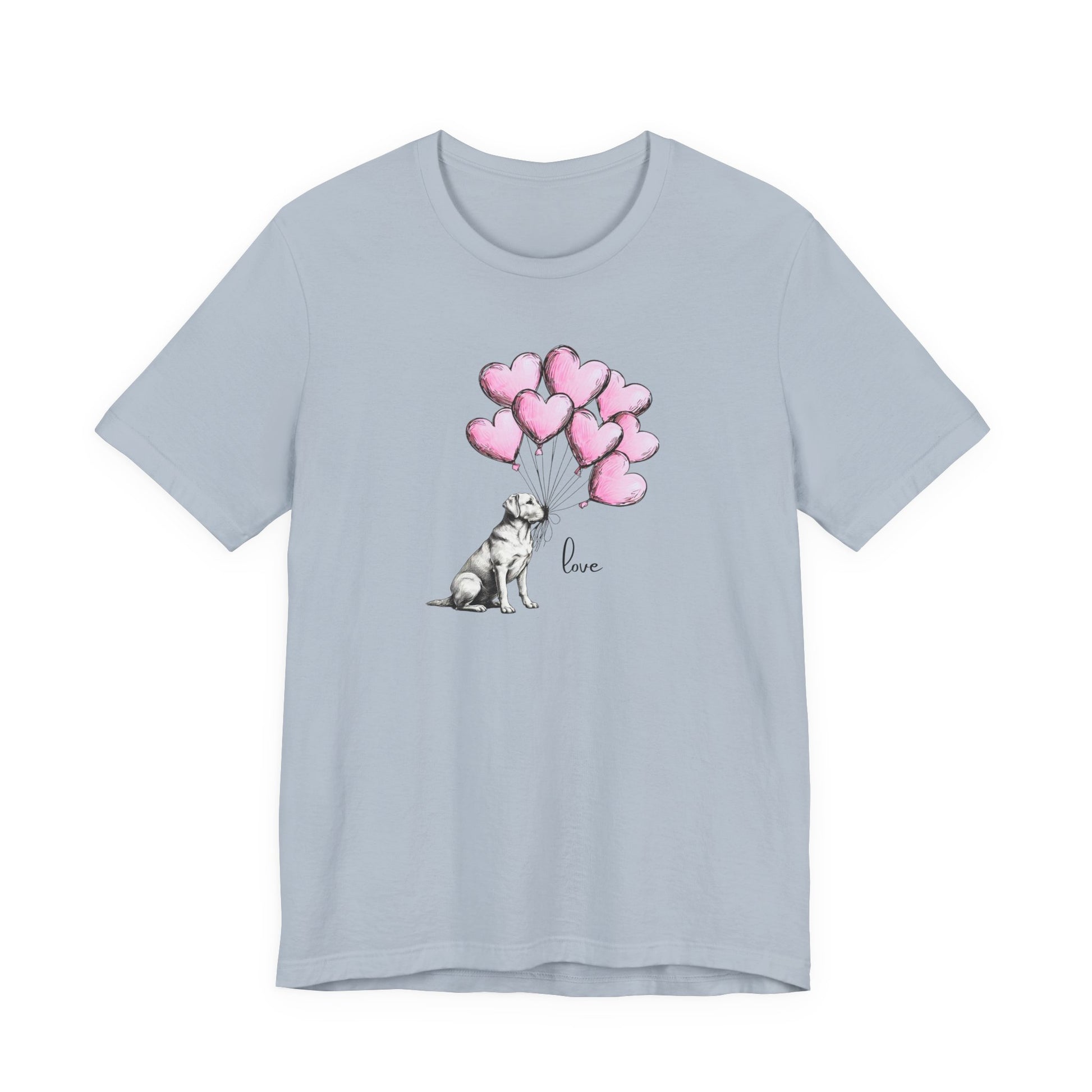 A cute Labrador Retriever Dog Holding Heart Balloons design on a comfortable and breathable T-shirt. Perfect for dog lovers and those who appreciate adorable and heartwarming designs. The ideal gift for Valentine's Day, birthdays, or any occasion to spread love and joy.