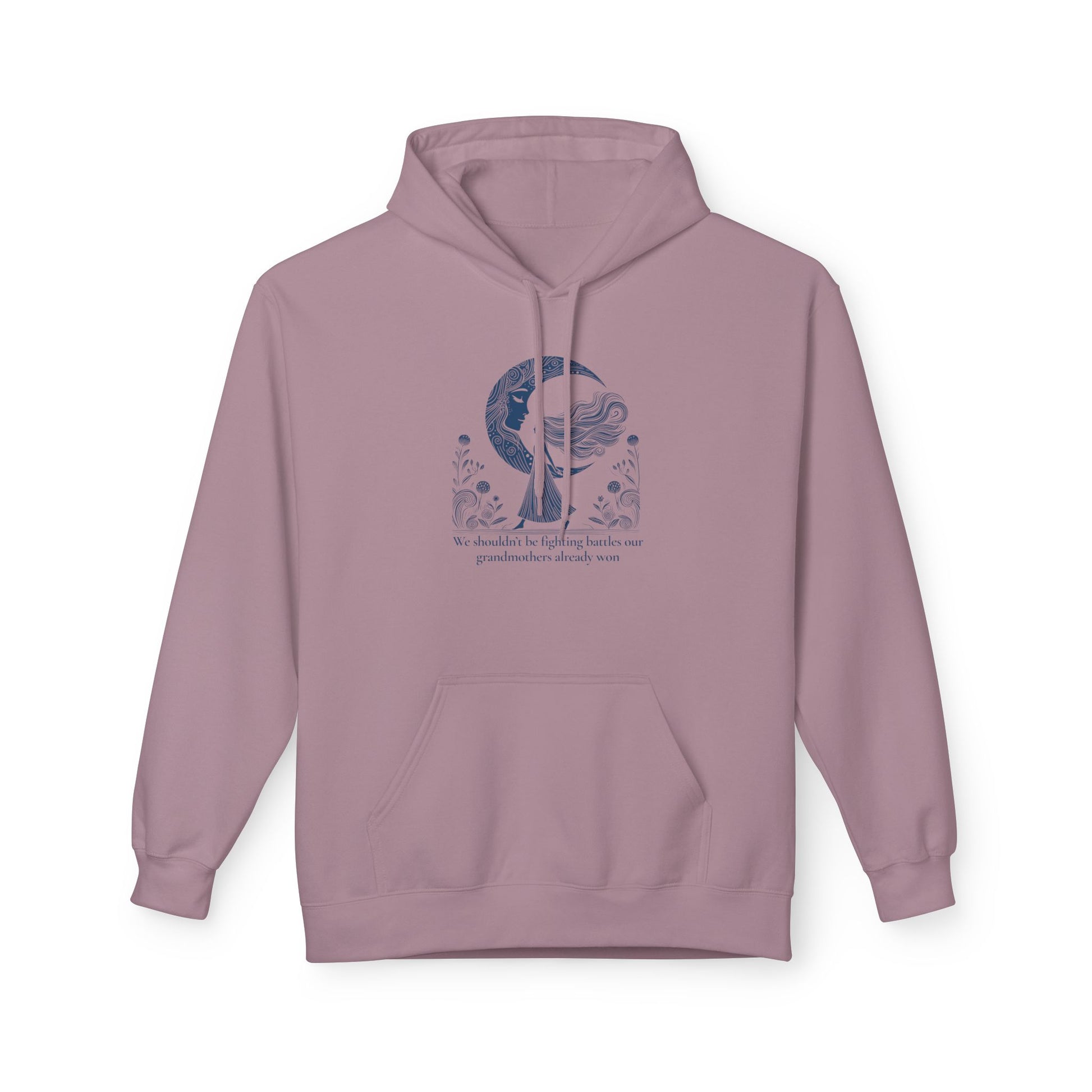 A soft, meaningful statement piece. This hoodie features a flowing illustrative design of a woman beside the moon with the quote “We shouldn’t be fighting battles our grandmothers already won.”