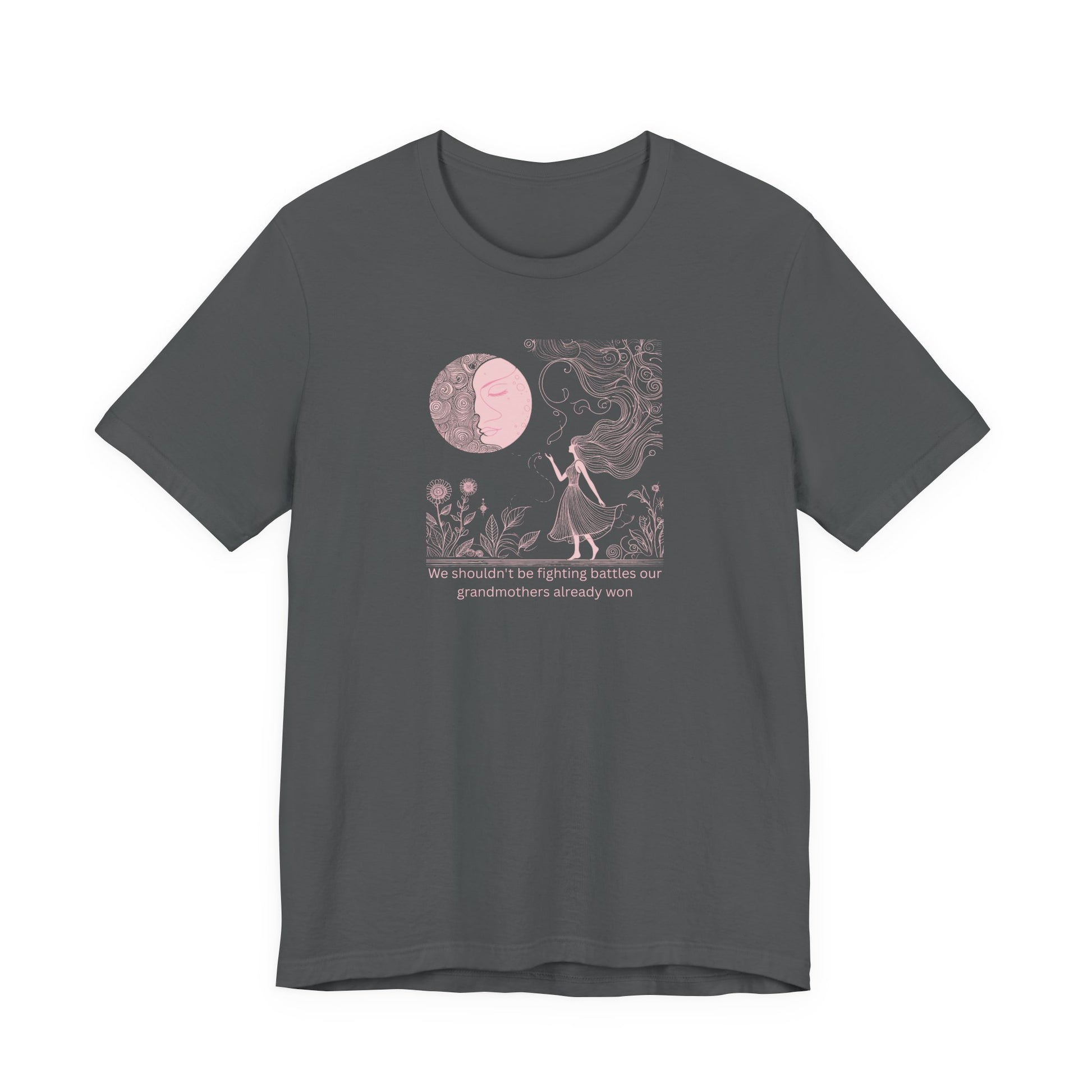 Soft yet powerful, this tee is for those who walk with quiet strength and a rebellious spark. Featuring an ethereal moon goddess, wildflowers, and the quote "We shouldn't be fighting battles our grandmothers already won," this design honors the women who came before us—and those still rising.