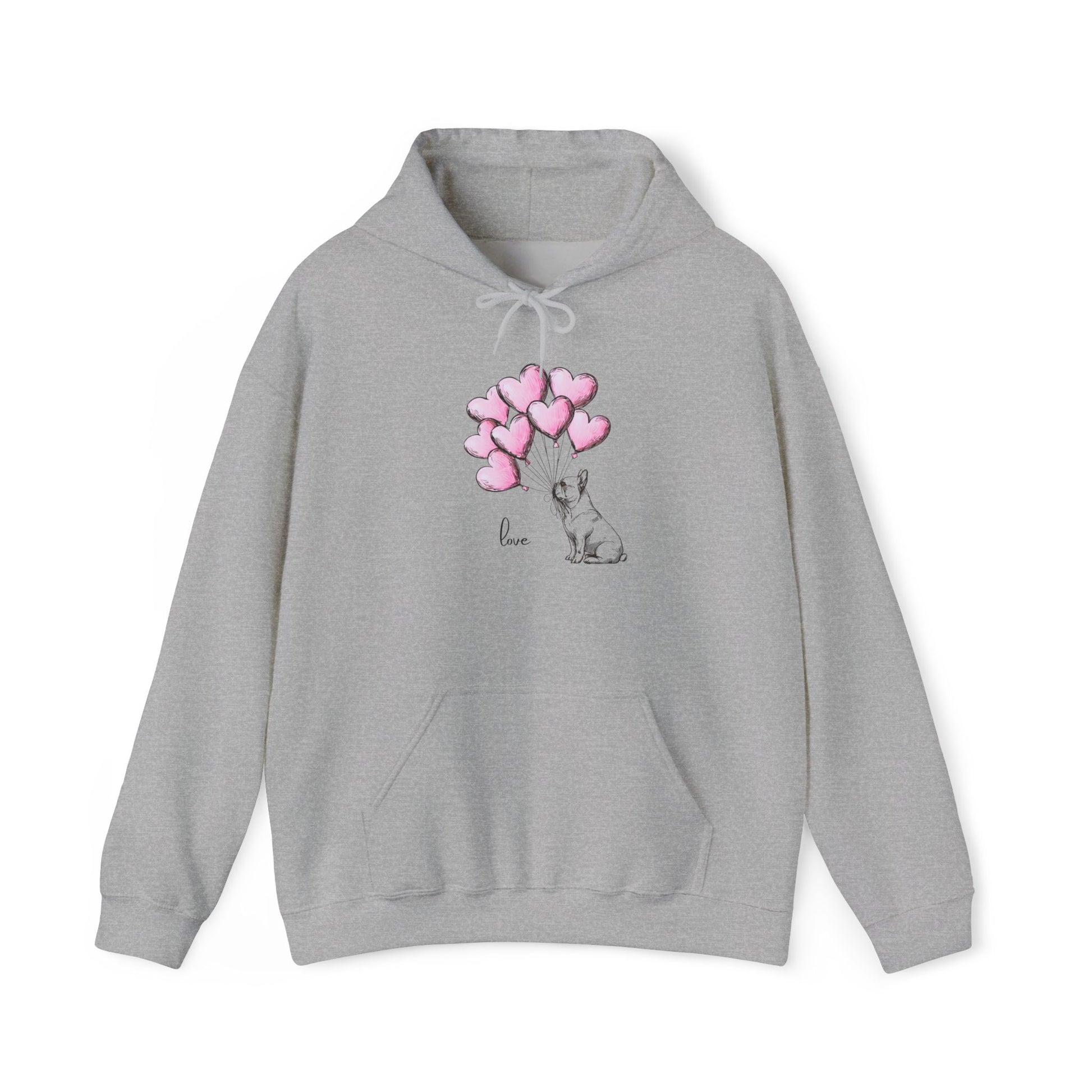 Bring a little love wherever you go with this French Bulldog Love Hoodie. A soft, cozy sweatshirt featuring a hand-drawn Frenchie holding heart-shaped balloons - a gentle reminder that love always lifts us higher.