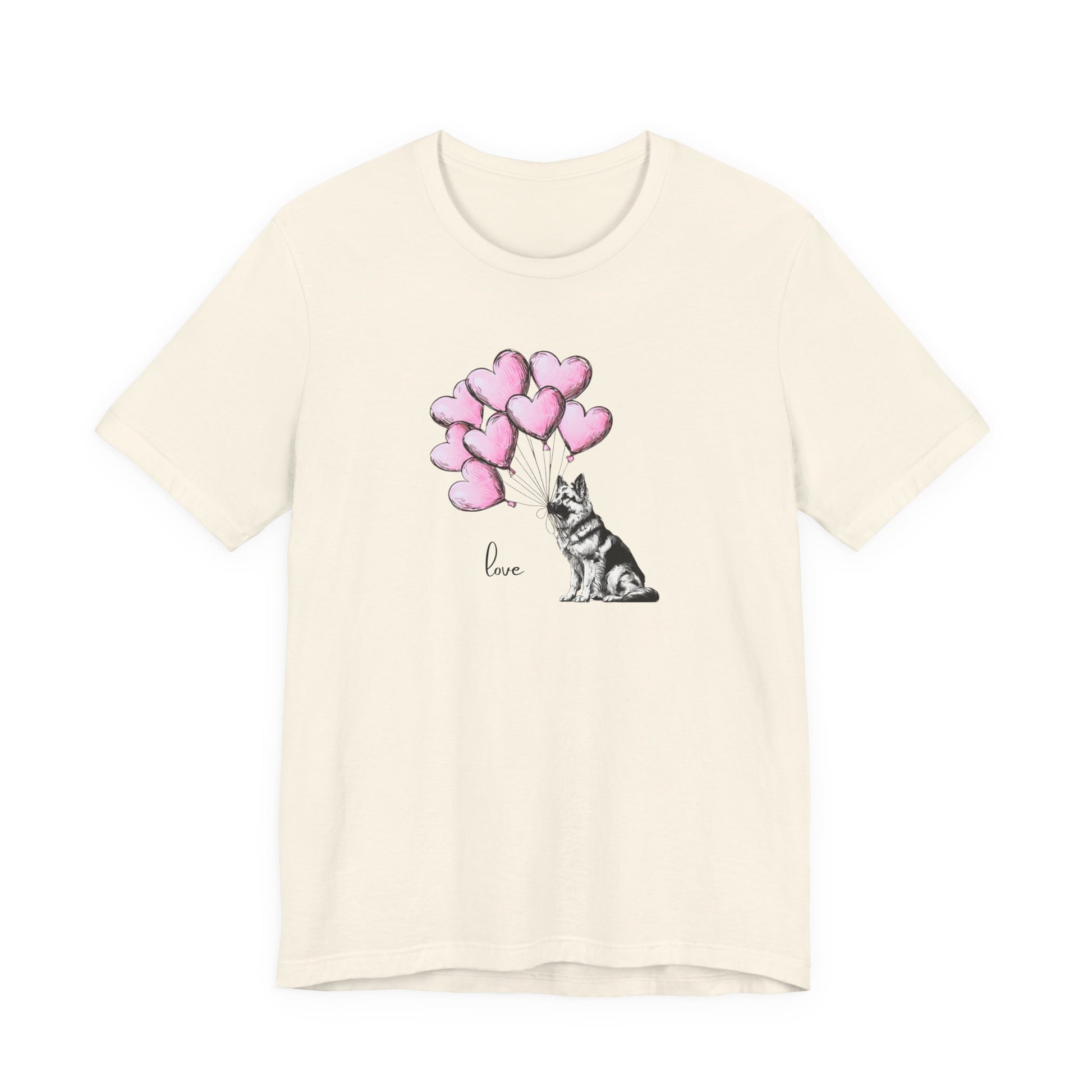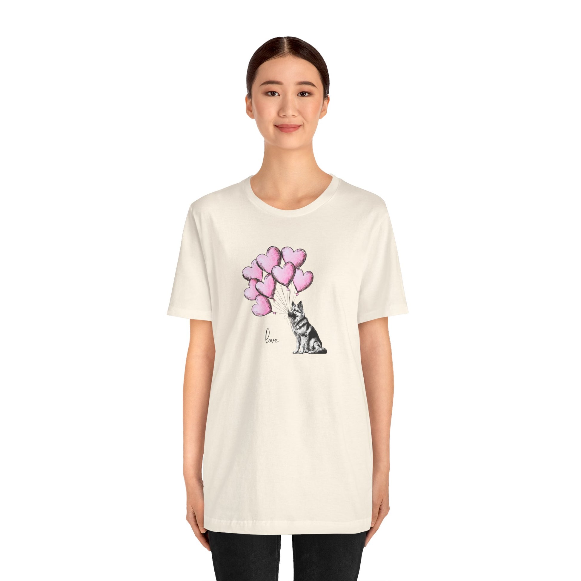 Strong, loyal, and full of love- just like your favorite four-legged friend. This tee features a detailed German Shepherd holding a bunch of heart-shaped pink balloons, with the word love gently written beneath. It’s the perfect match for anyone whose heart belongs to a Shepherd.