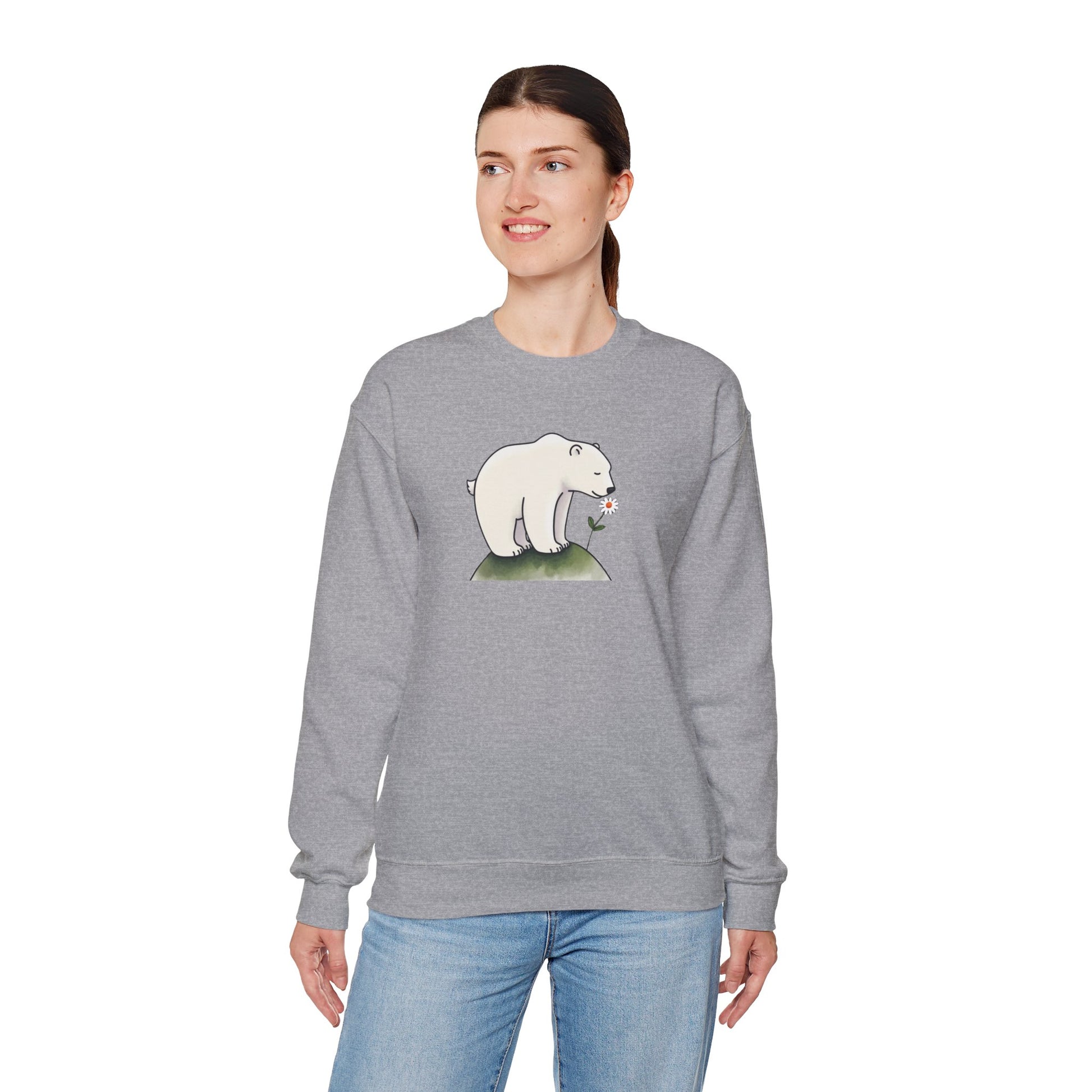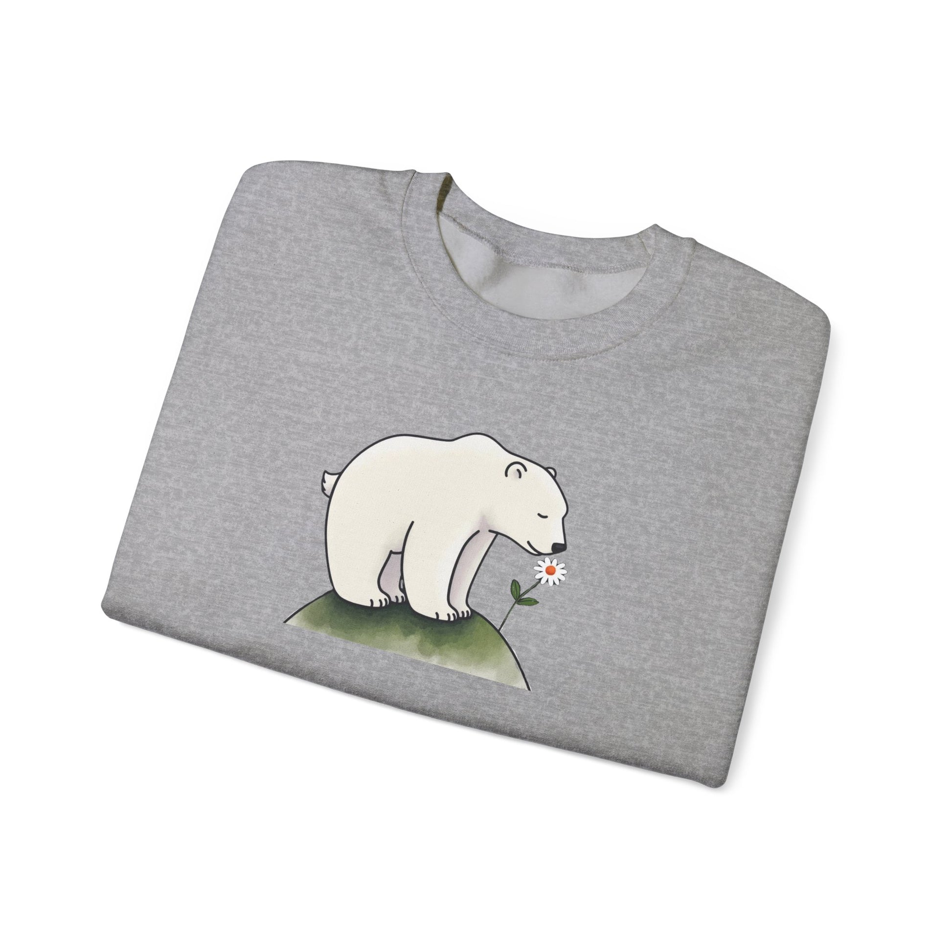 A gentle reminder to slow down and appreciate the little things. Our Minimalist Polar Bear Sweatshirt captures a peaceful moment — a curious bear pausing to smell a single daisy on a quiet hill.