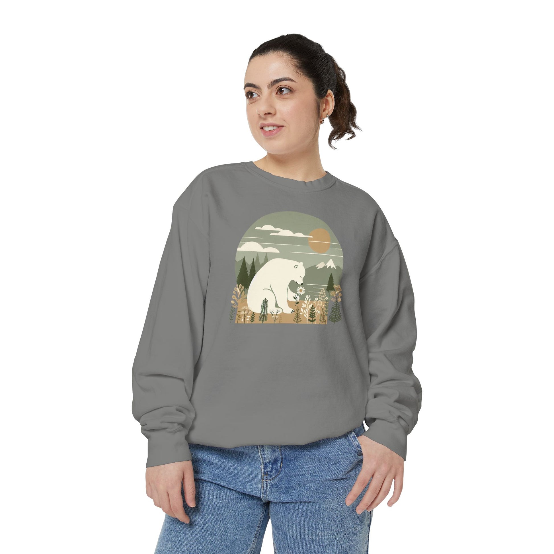 • Find serenity in the wild. Step into a dream of the north with our "Moonlit Meadow" Sweatshirt. This flagship piece features a soulful polar bear wandering through a blooming mountain meadow under the soft glow of an arctic sun. With its serene, muted color palette and intricate linework, it captures the gentle strength of the wild. Printed on legendary Comfort Colors® garment-dyed fleece, it offers a vintage-soft, lived-in feel that only gets better with every moon cycle.