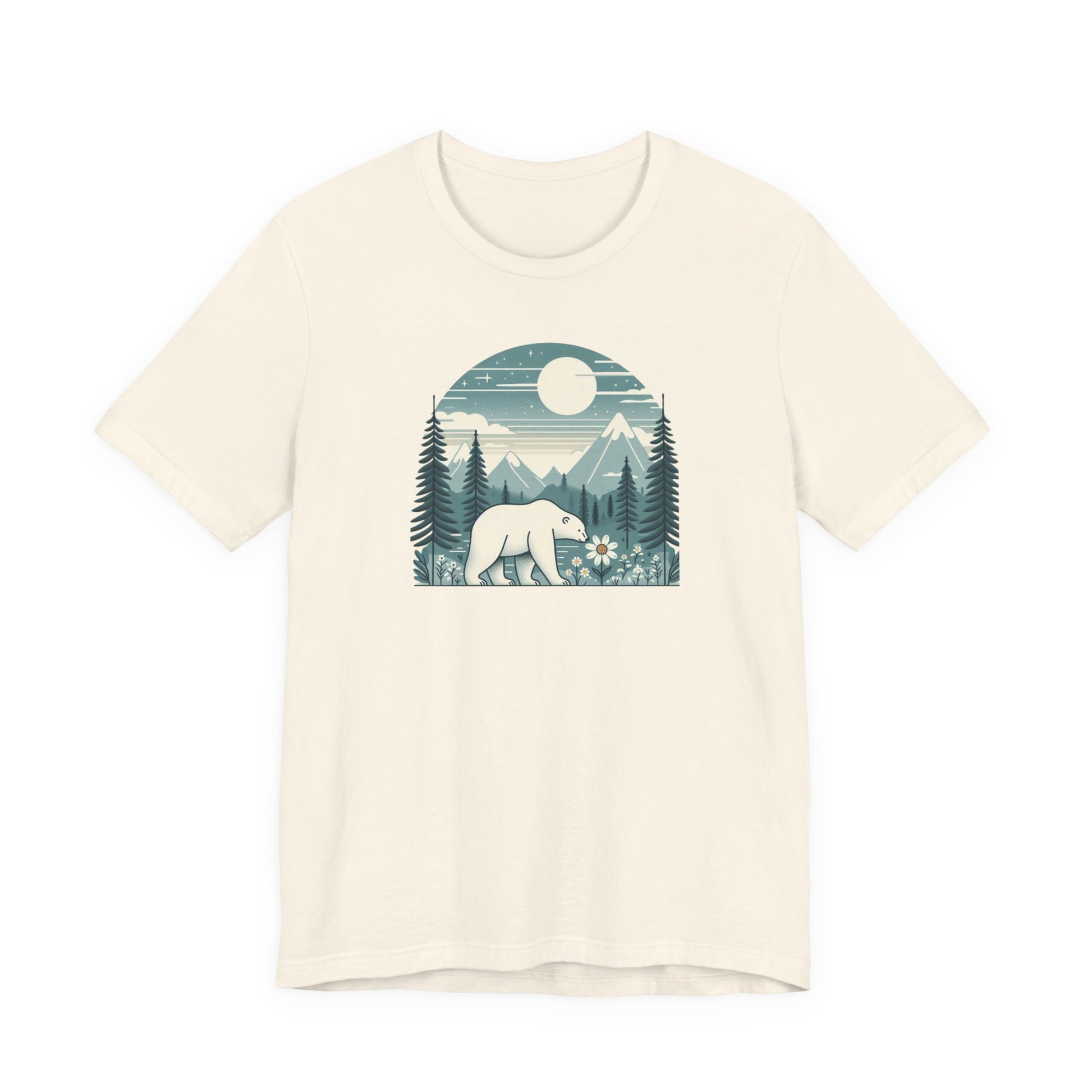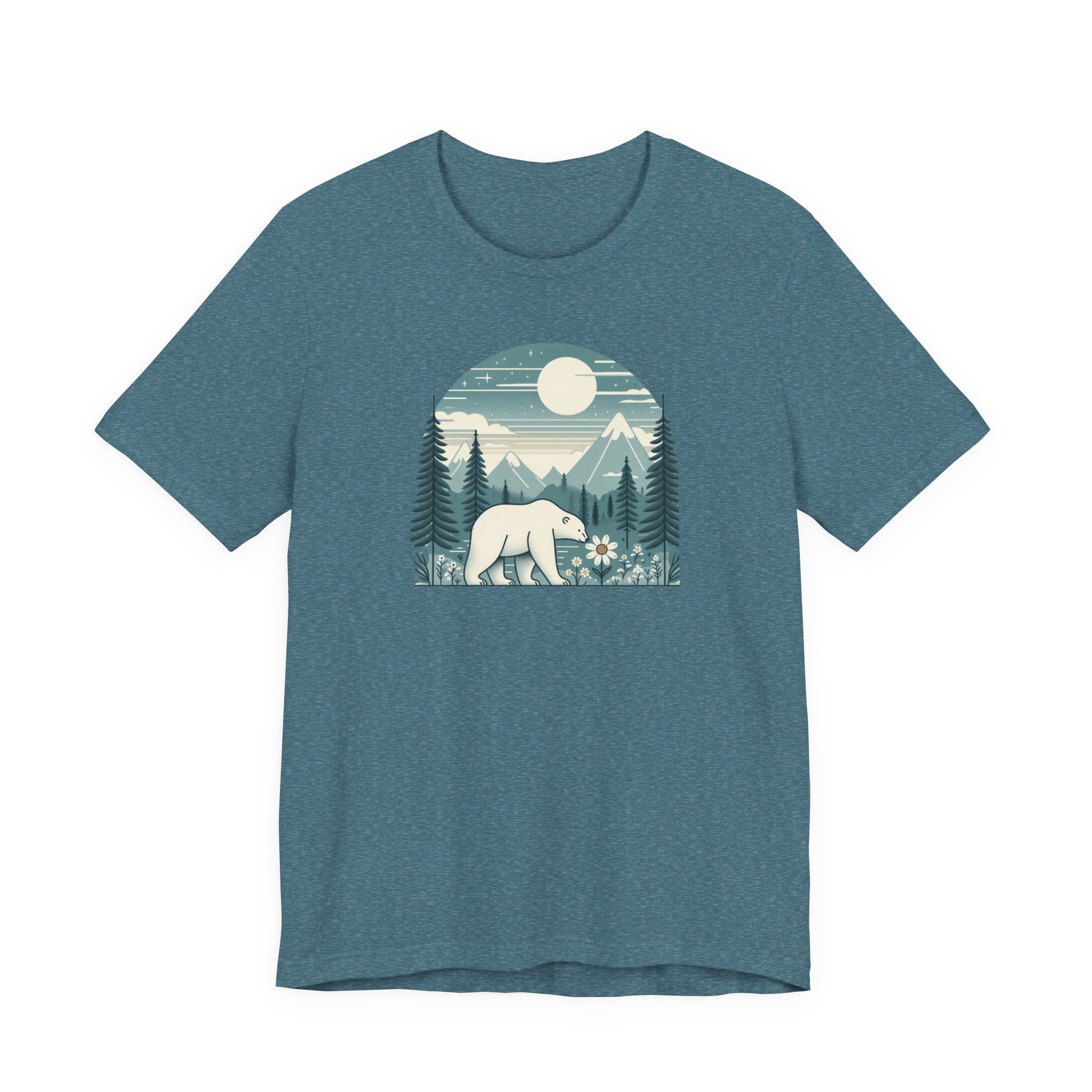 This peaceful polar bear mountain tee brings a soft touch of nature to your everyday style. The artwork features a gentle bear exploring wildflowers beneath a glowing moon, surrounded by tall pines and cool alpine tones. It creates a calm and uplifting feeling that fits perfectly with slow mornings, cozy walks, and outdoor moments.
