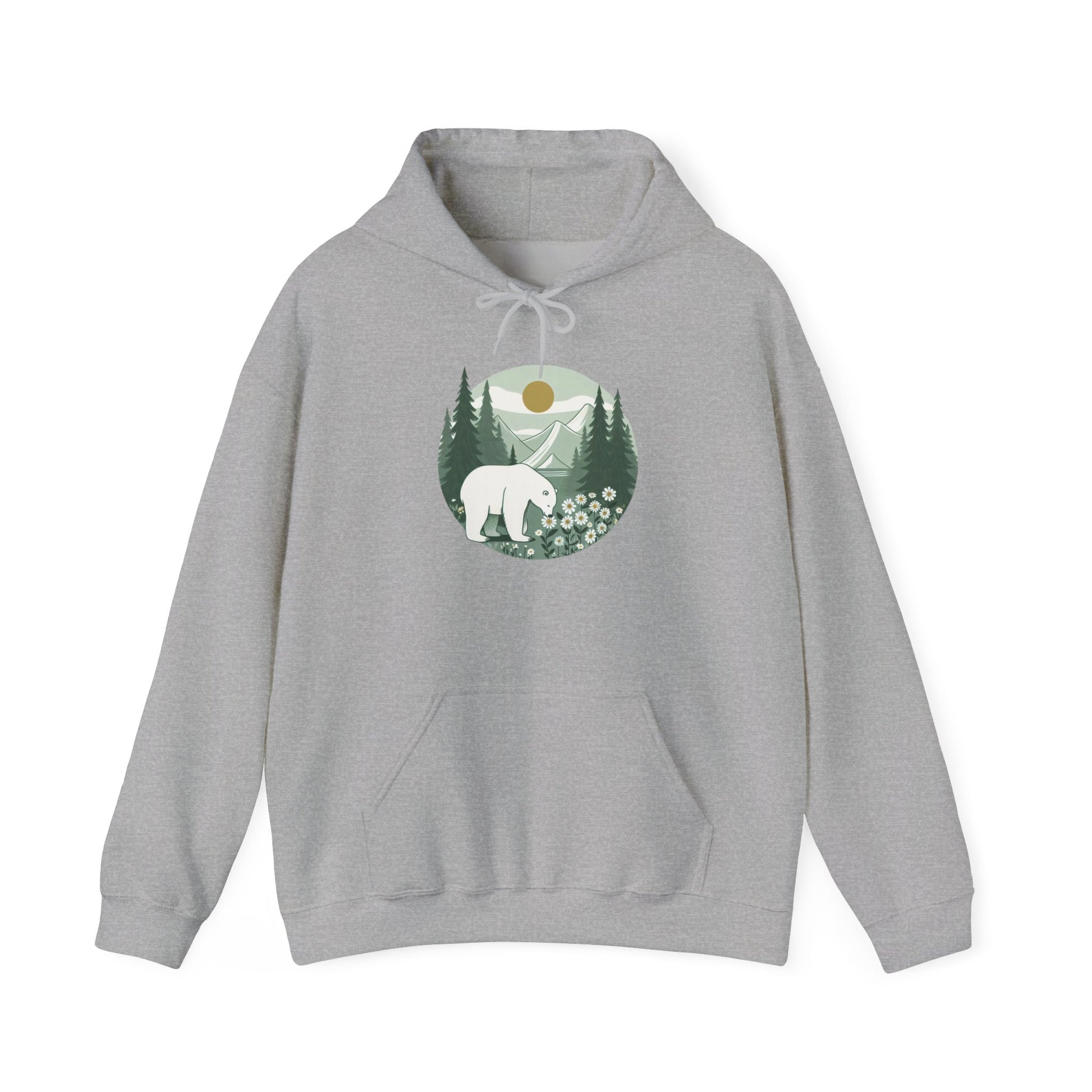 Step into serenity with this peaceful polar bear design, surrounded by mountain pines and wildflowers beneath a golden sun.