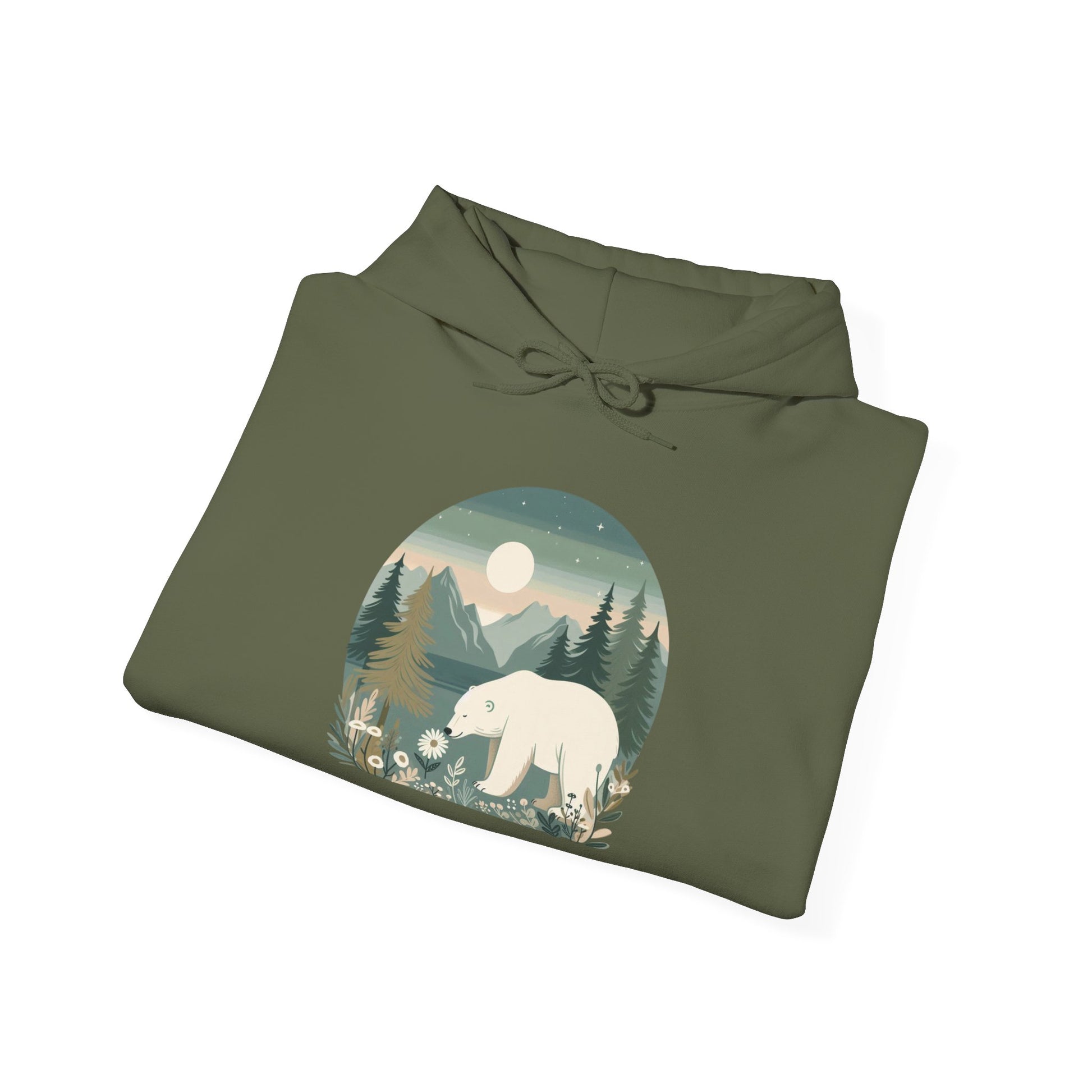 Carry the magic of a quiet night with this Moonlit Bear Hoodie. A peaceful polar bear pauses under a glowing moon, surrounded by mountains, pine trees, and wildflowers. Cozy, soft, and nature-inspired, this hoodie is perfect for stargazers, dreamers, and anyone who finds joy in the calm of the outdoors.