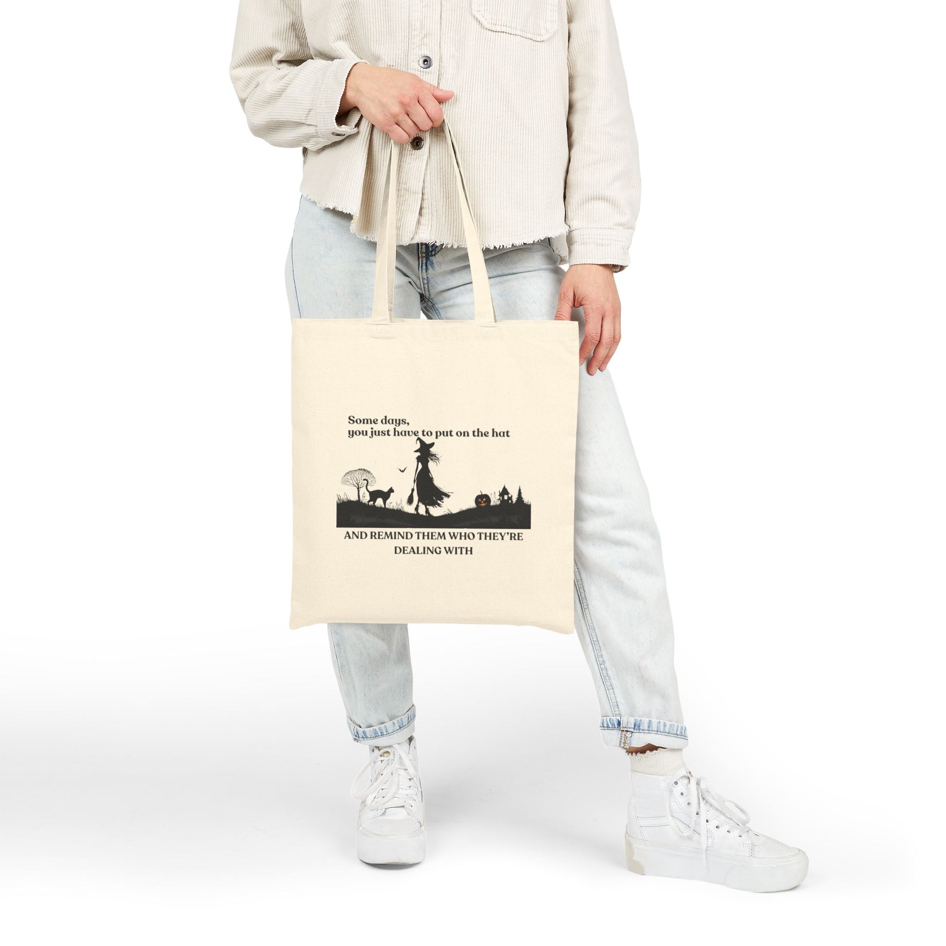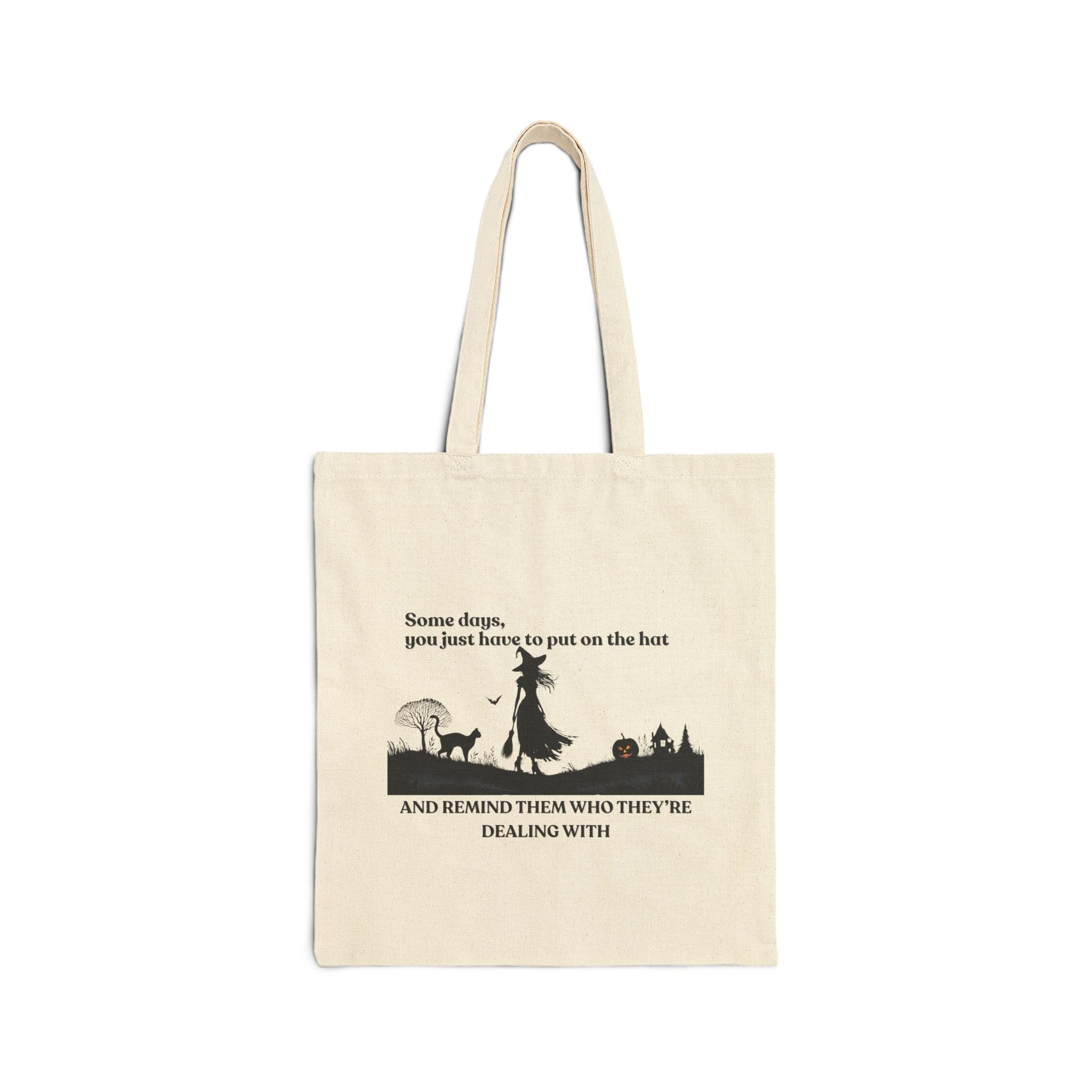 • Remind them who they’re dealing with. Carry your power with our "Put On The Hat" Heritage Tote. This striking silhouette design features a defiant witch and her familiar against a detailed moonlight landscape. Printed on both sides of our durable natural cotton canvas, this bag is more than an accessory—it’s a sophisticated reminder of the magic you carry.