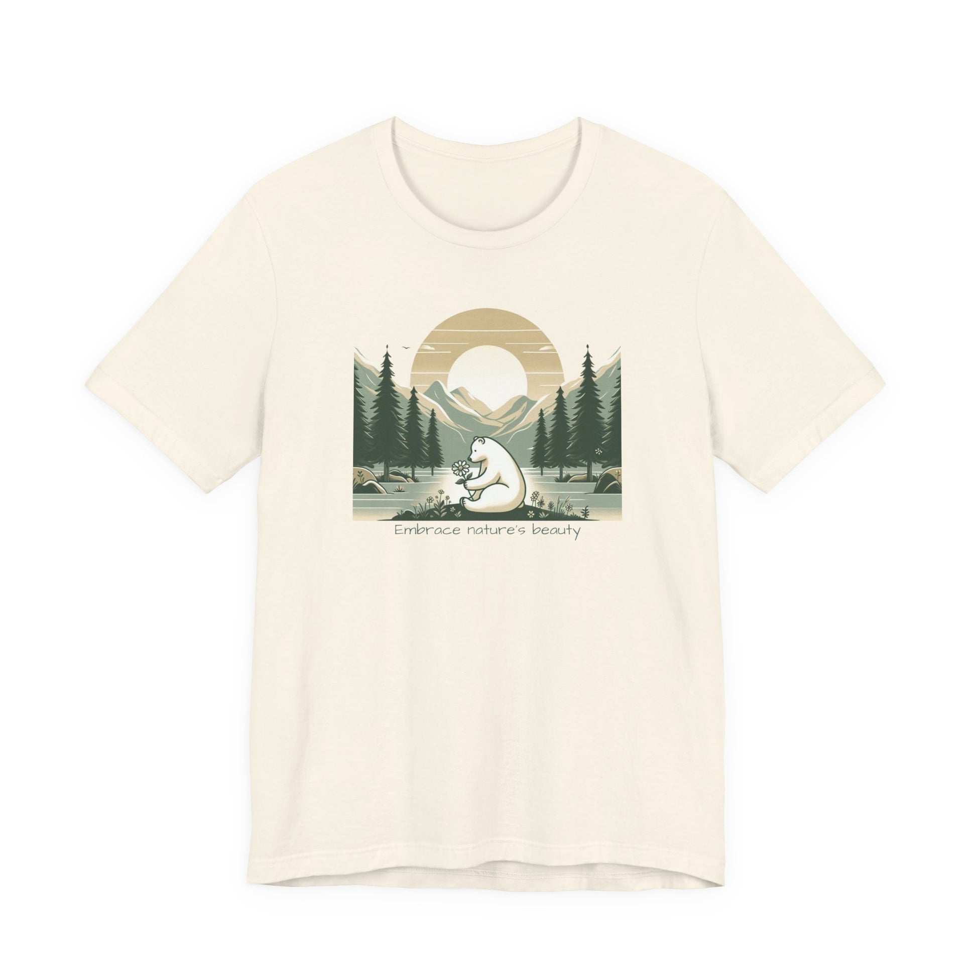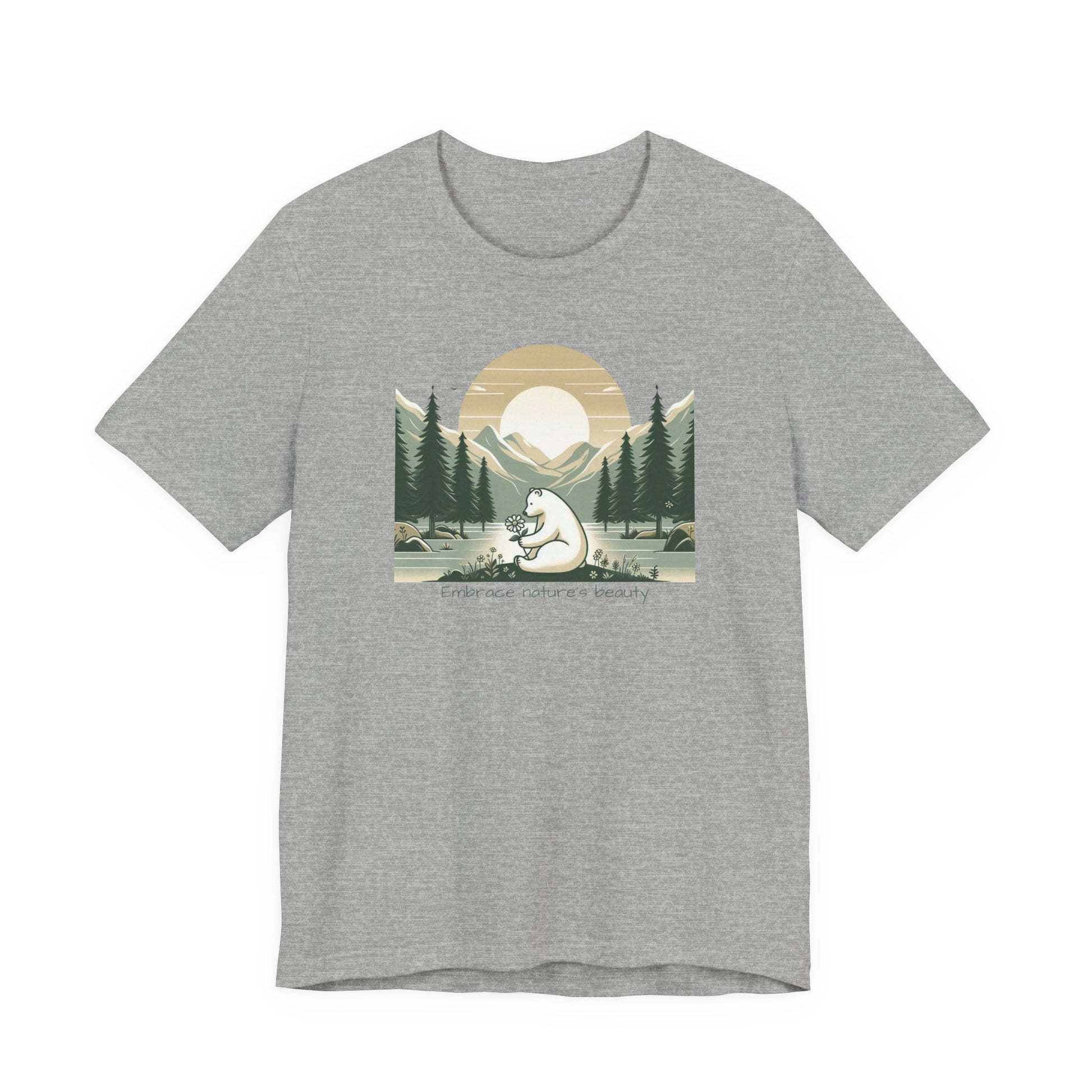 This gentle design features a polar bear sitting by a lake, holding a daisy beneath golden light and mountain peaks — a quiet moment that captures the heart of your Nature’s Kindness collection.