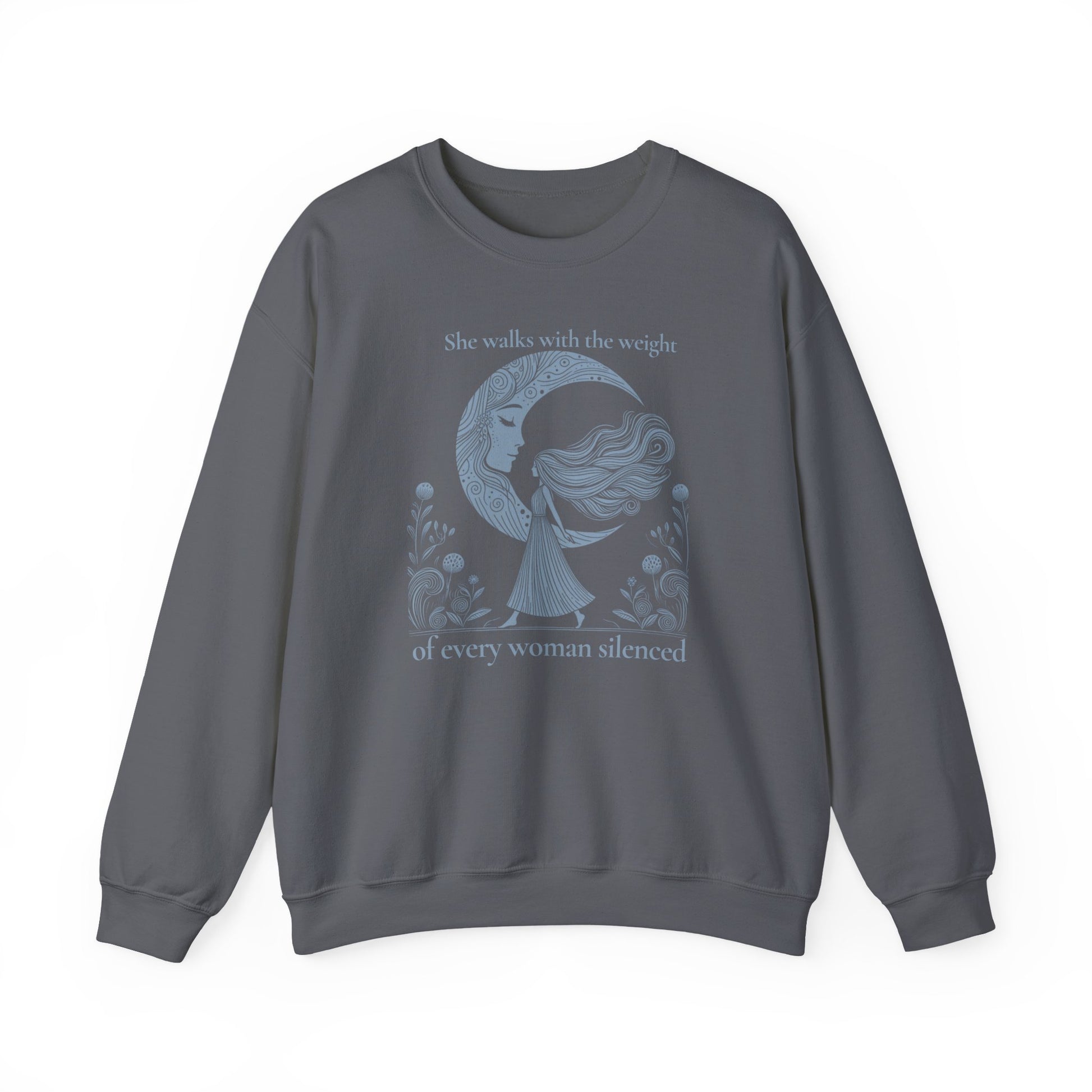 A soft but powerful statement piece inspired by strength, resilience, and the voices that came before us. This artwork features a woman walking beneath the moon, carrying the weight of every woman silenced.