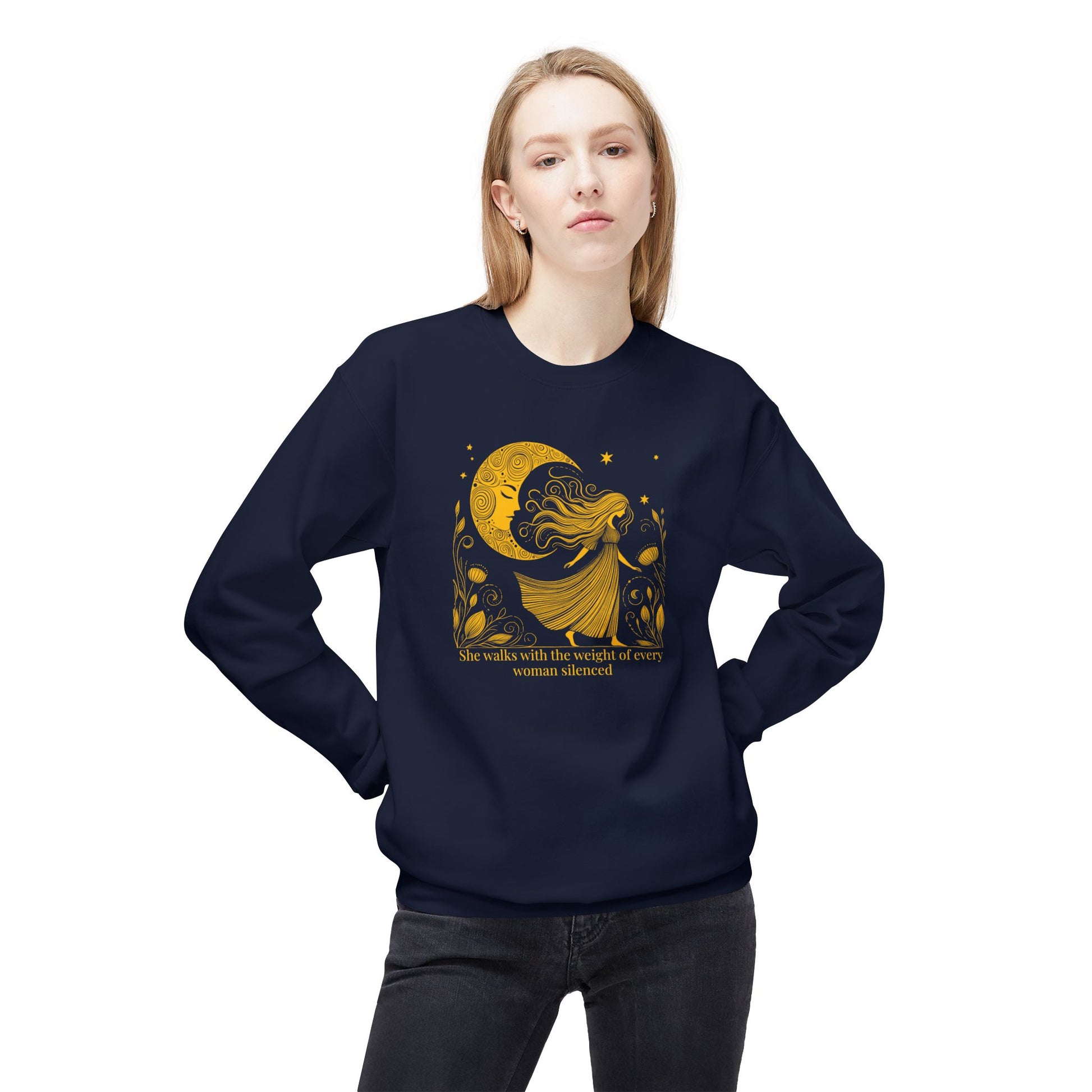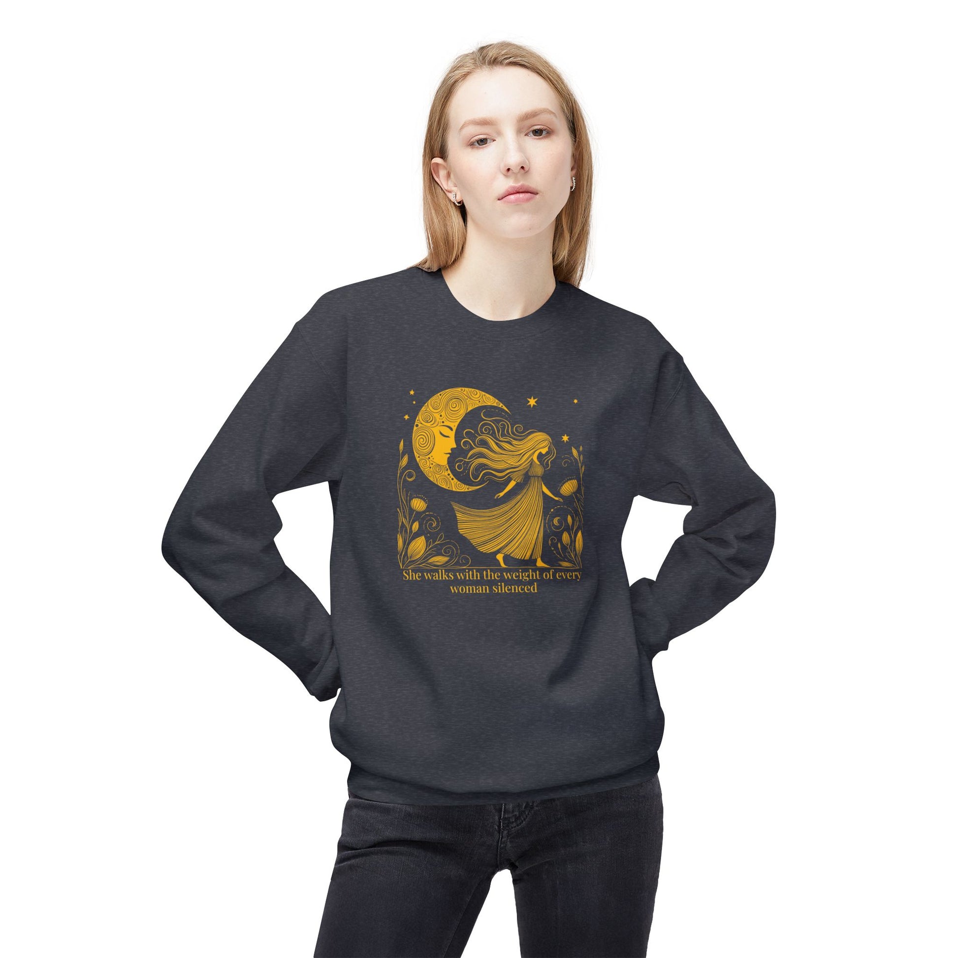 Step into strength and solidarity with this empowering sweatshirt. Featuring a moon goddess walking beneath the stars, the artwork honors every woman whose voice has been silenced - and the power of those who carry their stories forward. Printed in a striking antique gold on soft fleece, this crewneck is as bold as it is cozy.