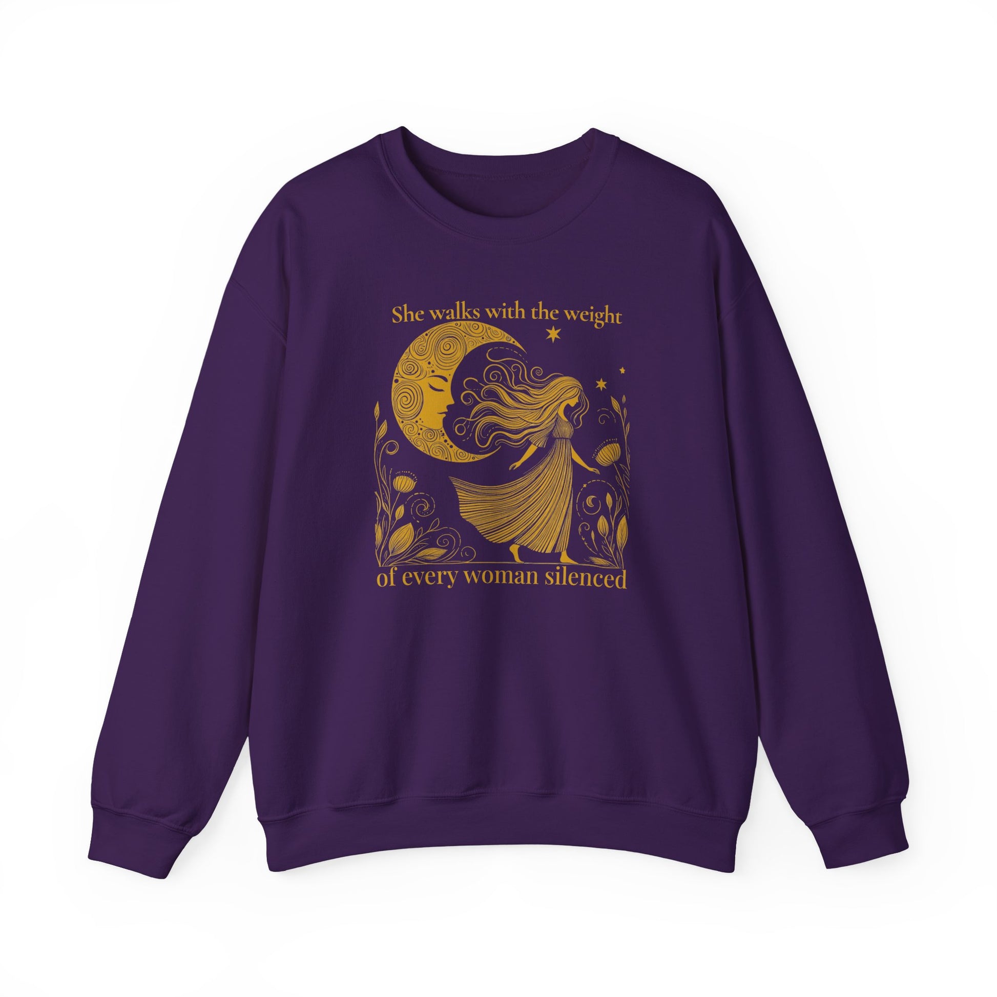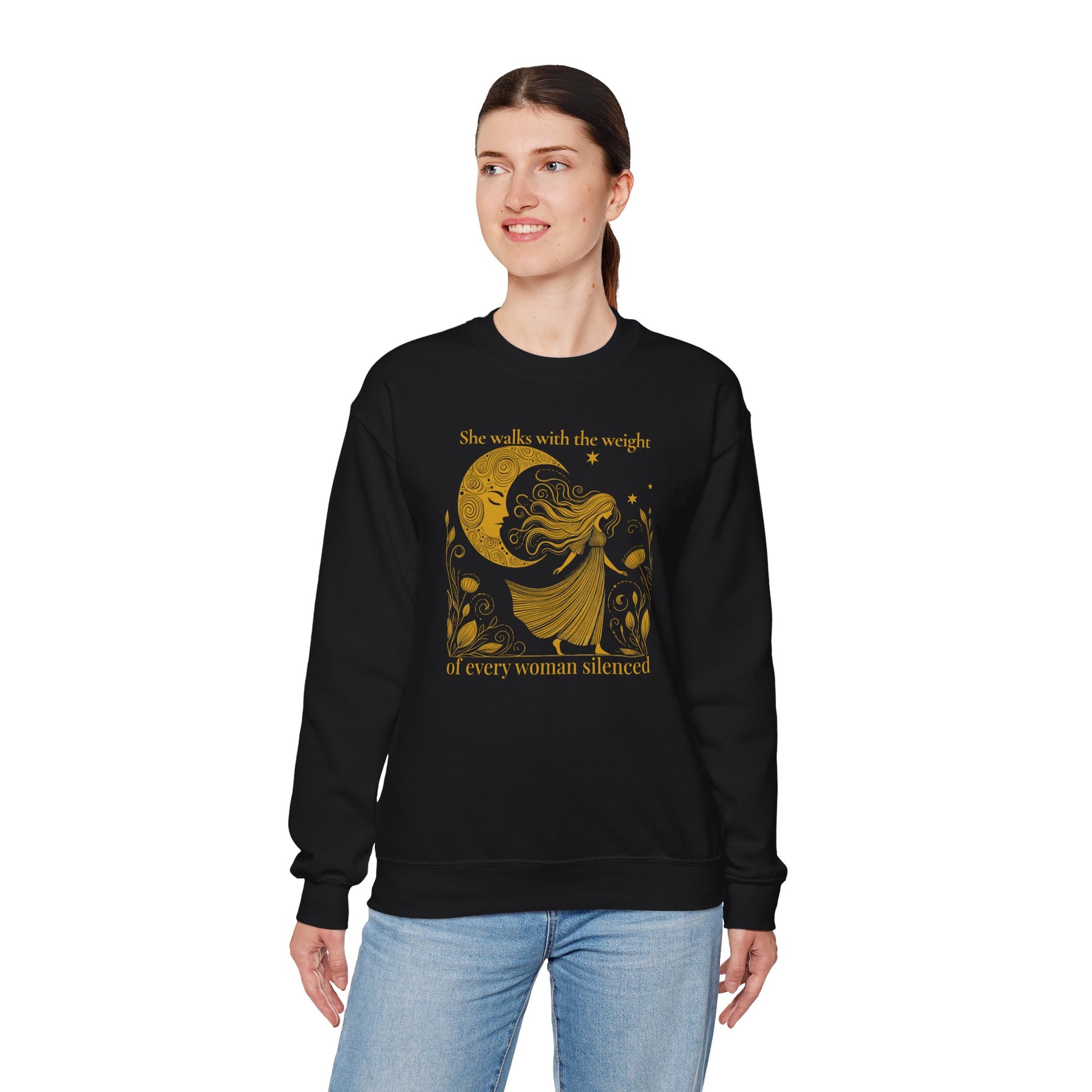 This celestial design pairs warm gold illustration with the words “She walks with the weight of every woman silenced,” creating a piece that feels meaningful, cozy, and quietly bold.