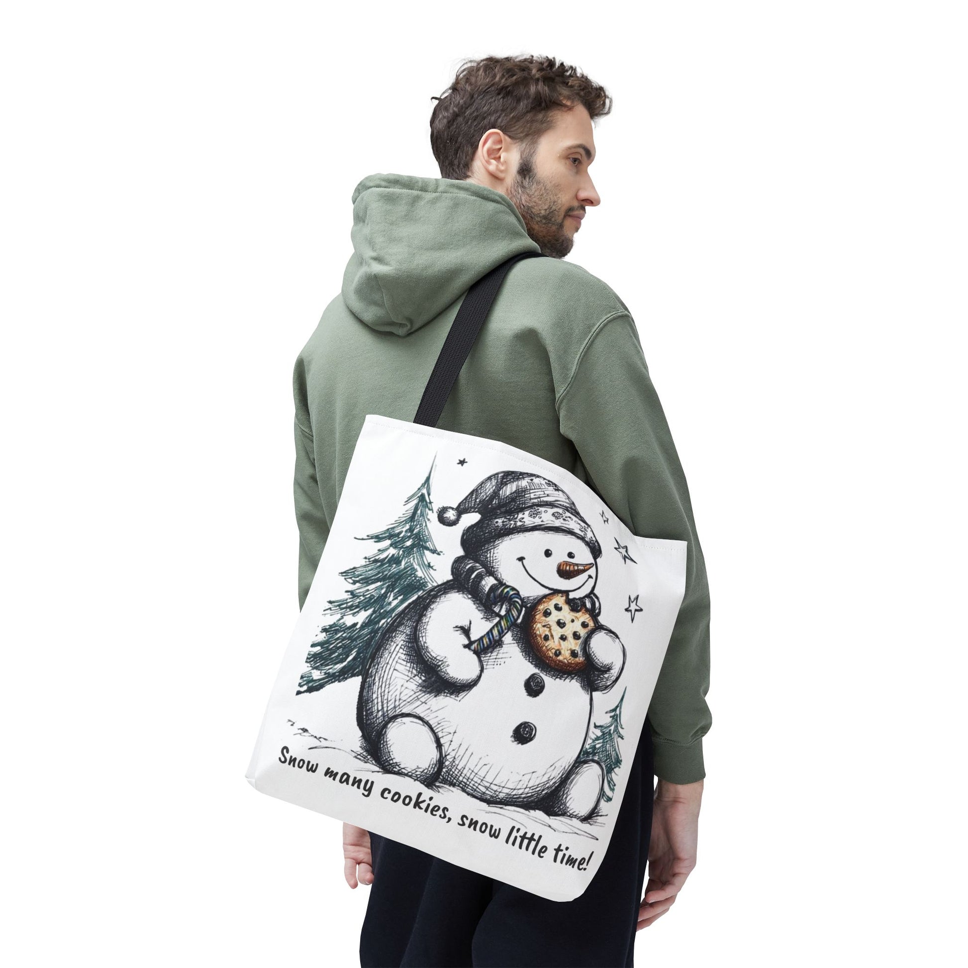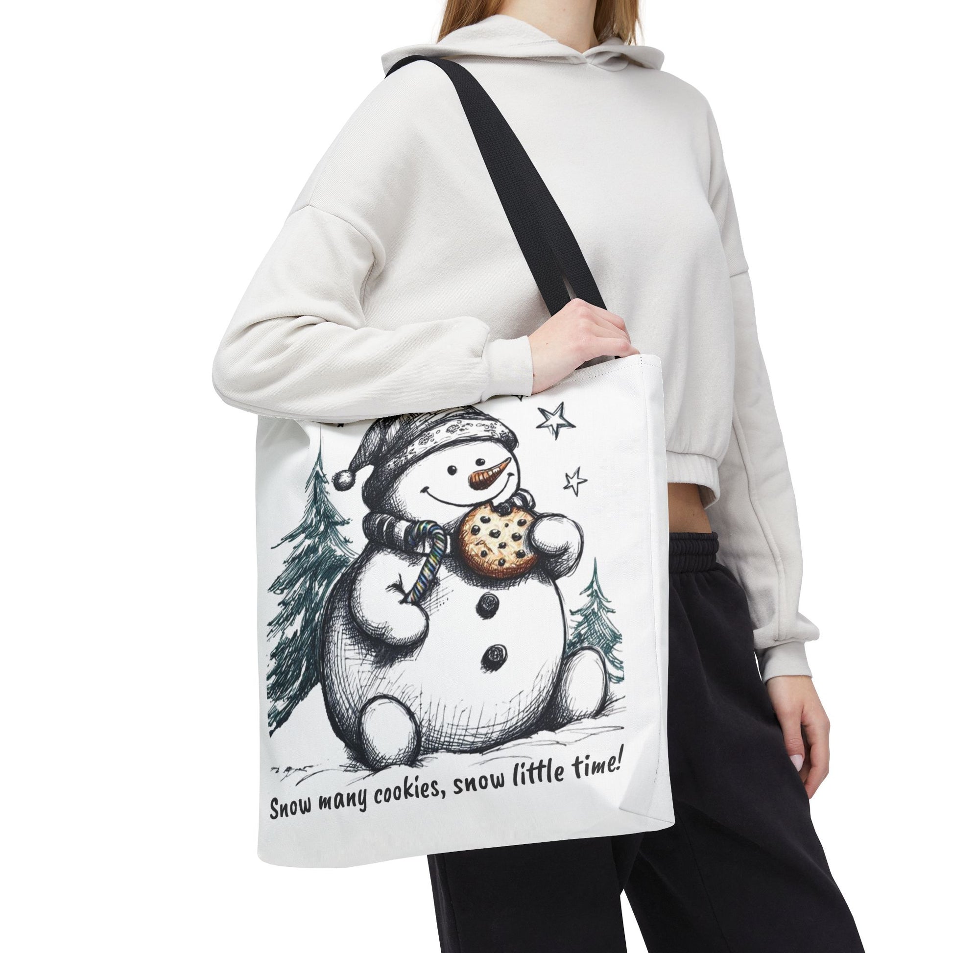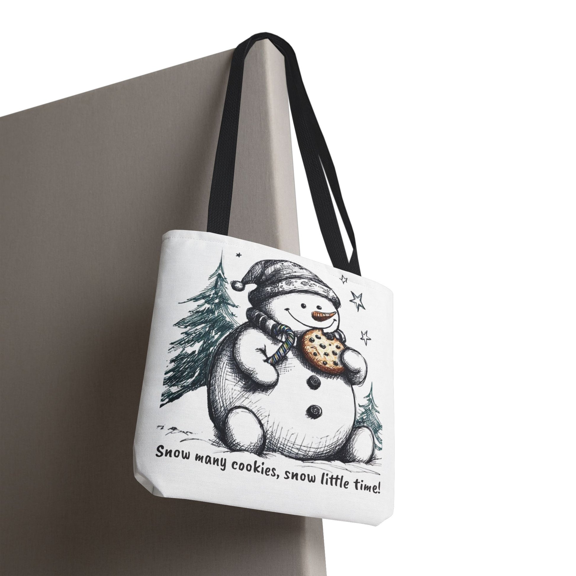 Carry holiday cheer wherever you go with our 18-inch “Snow Many Cookies” tote bag. Featuring a whimsical snowman munching on a cookie amid snowy pines and twinkling stars, this roomy tote is perfect for gift runs, cookie swaps, or cozy winter errands. Made from durable fabric with sturdy black handles, it’s as practical as it is playful.