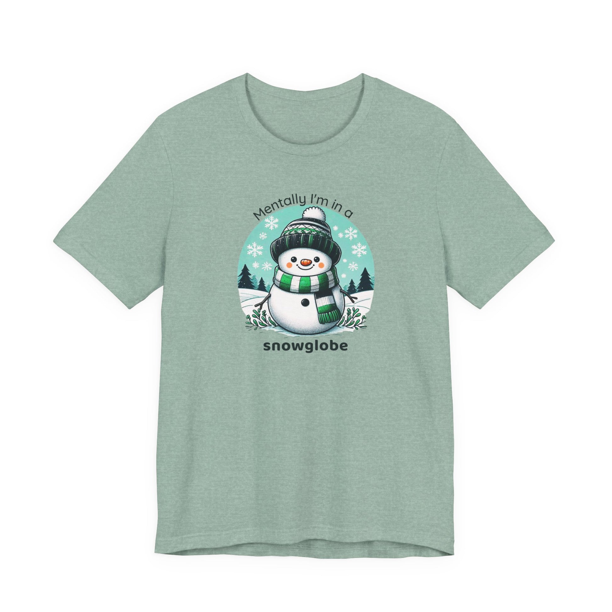 Step into a whimsical winter daydream with this Mentally I’m in a Snowglobe t-shirt. Featuring a cheerful snowman in a cozy knit hat and scarf surrounded by snowflakes, this design captures the magic of the holiday season with a playful twist.