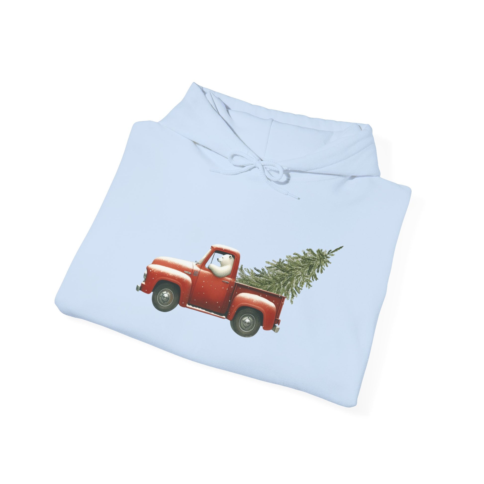 Wrap up in cozy holiday warmth with the Snowy Christmas Ride heavyweight hoodie. Featuring a cheerful polar bear behind the wheel of a vintage red truck carrying home a Christmas tree, this design brings nostalgic joy and winter comfort to your everyday style.