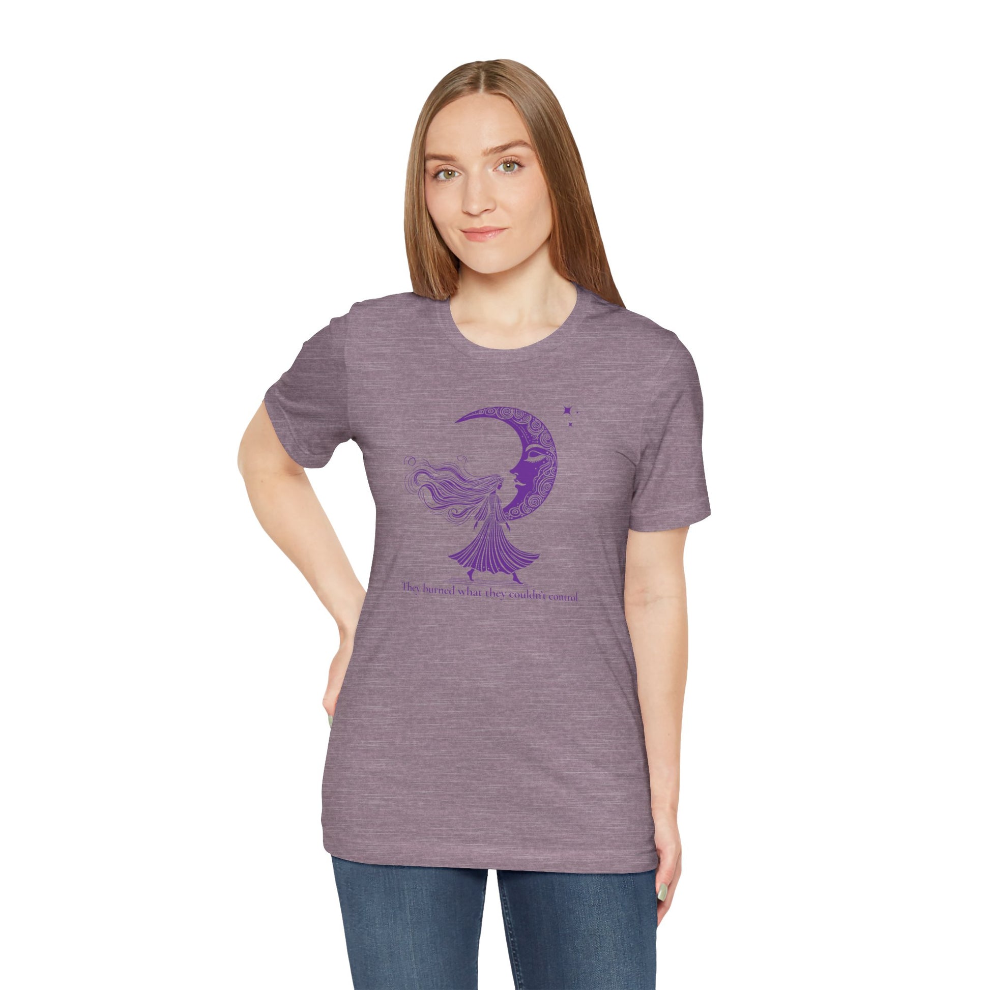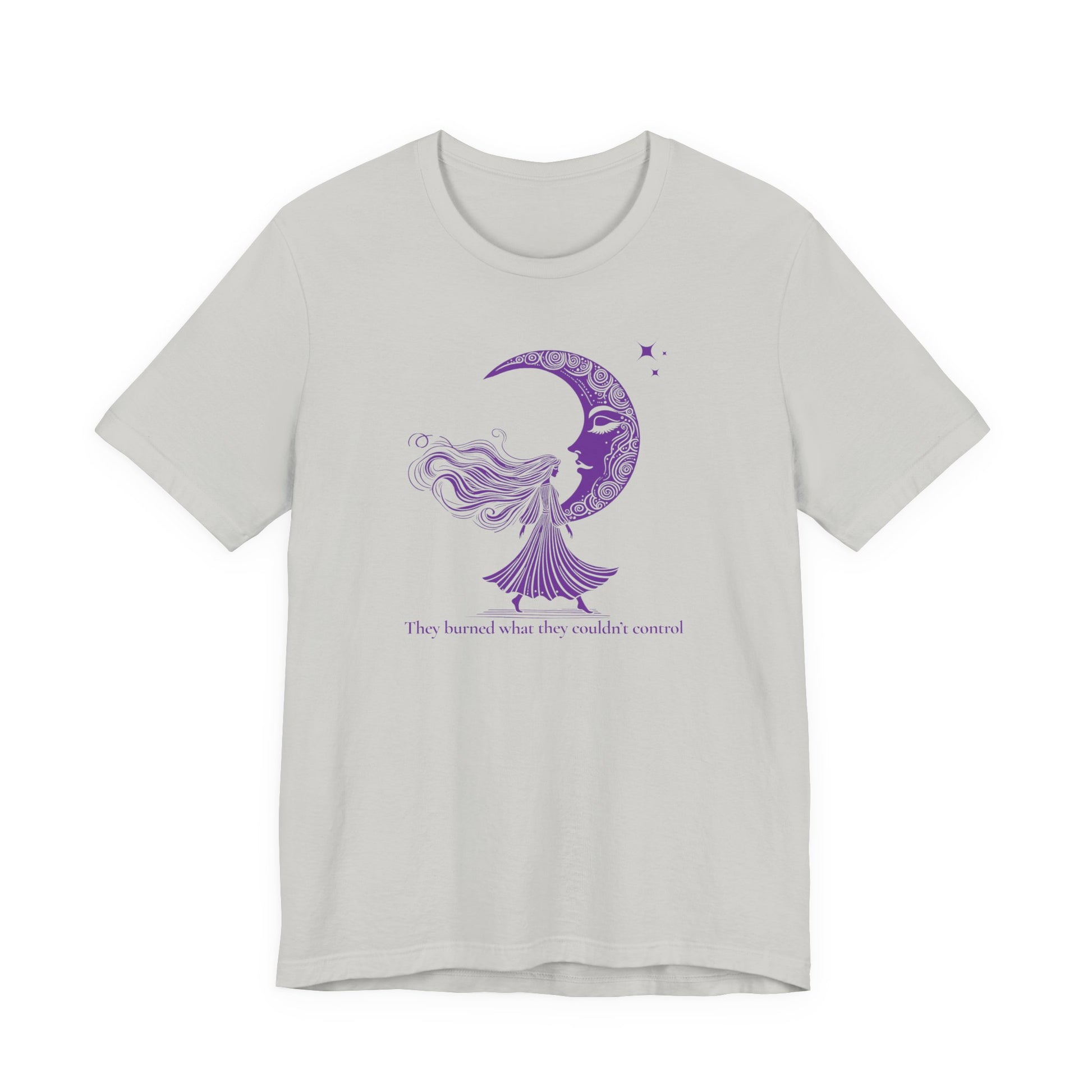 It's a tribute to the women they tried to silence. The ones who stood tall, wild-haired and defiant, under the watchful gaze of the moon. Printed in rich purple ink, this shirt blends poetic rebellion with bold elegance.