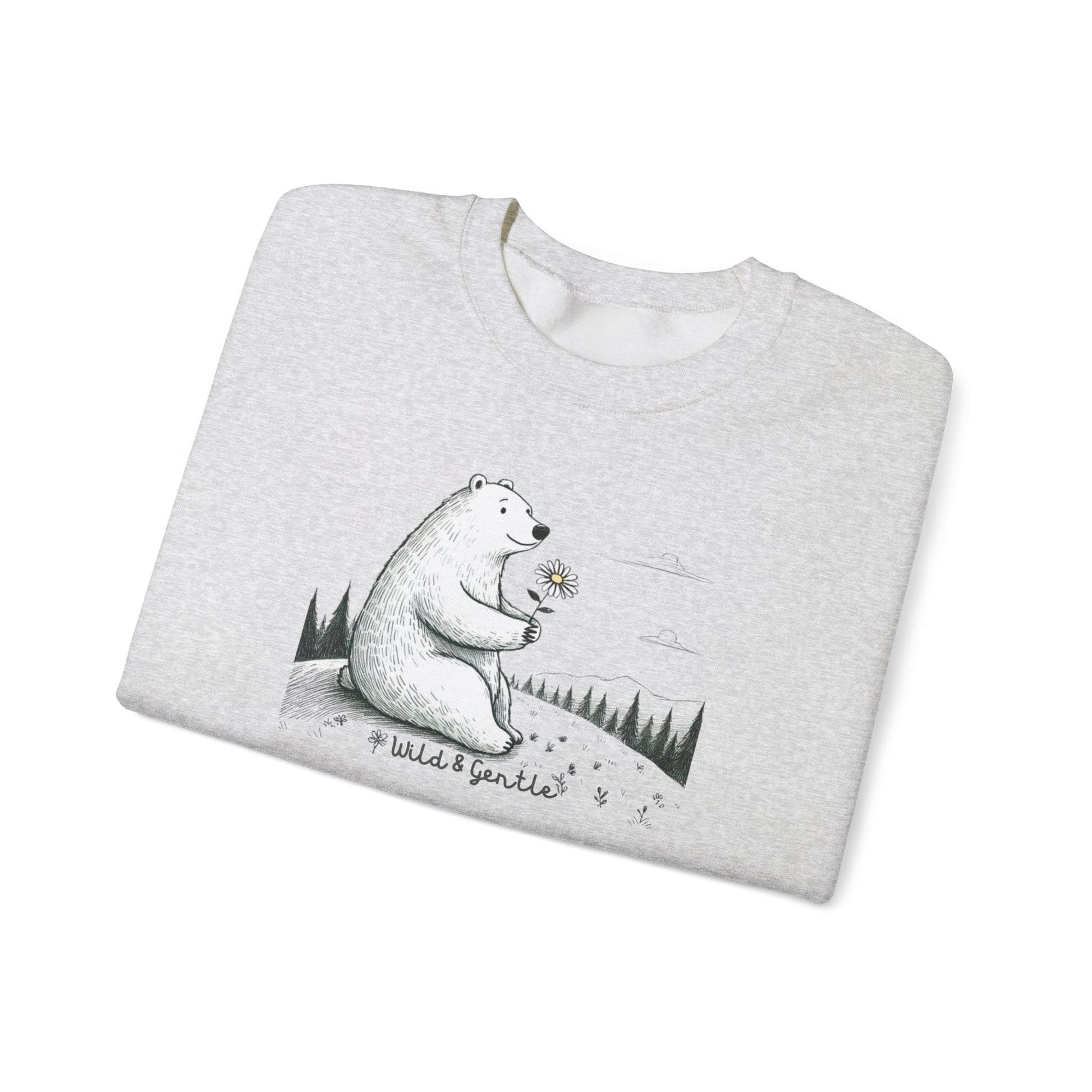 Wrap yourself in warmth and kindness with our Wild & Gentle polar bear sweatshirt. Featuring a hand-drawn bear holding a daisy against a peaceful mountain backdrop, this cozy crewneck is a reminder that strength and softness can live side by side.