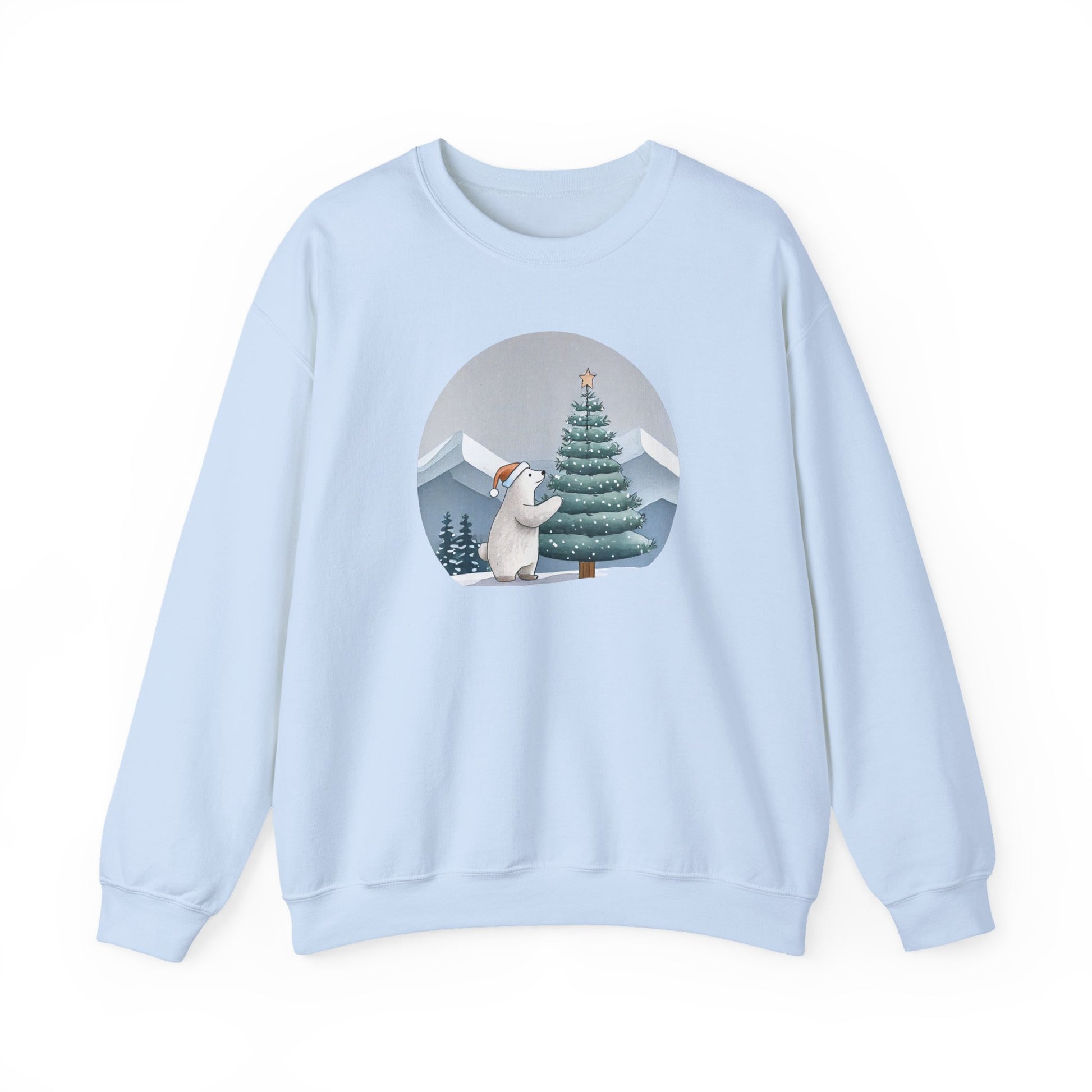 A calm winter moment in every stitch. Our Winter Glow Polar Bear Sweatshirt captures a sweet bear trimming a Christmas tree beneath mountain peaks and falling snow. A gentle design that feels peaceful, cozy, and timeless for the holidays.