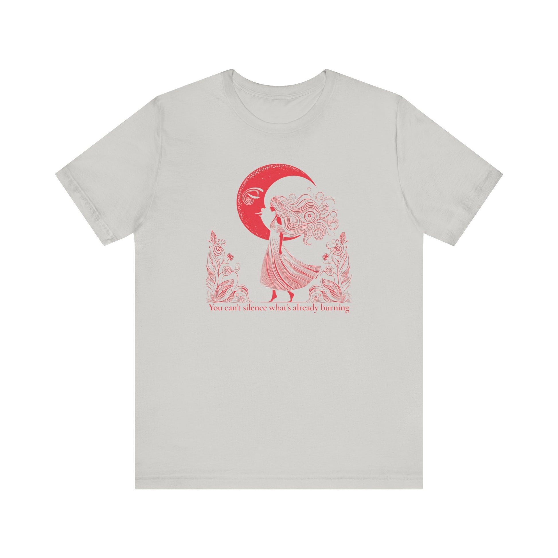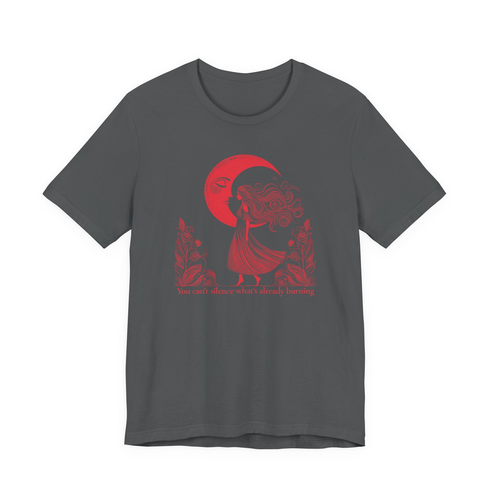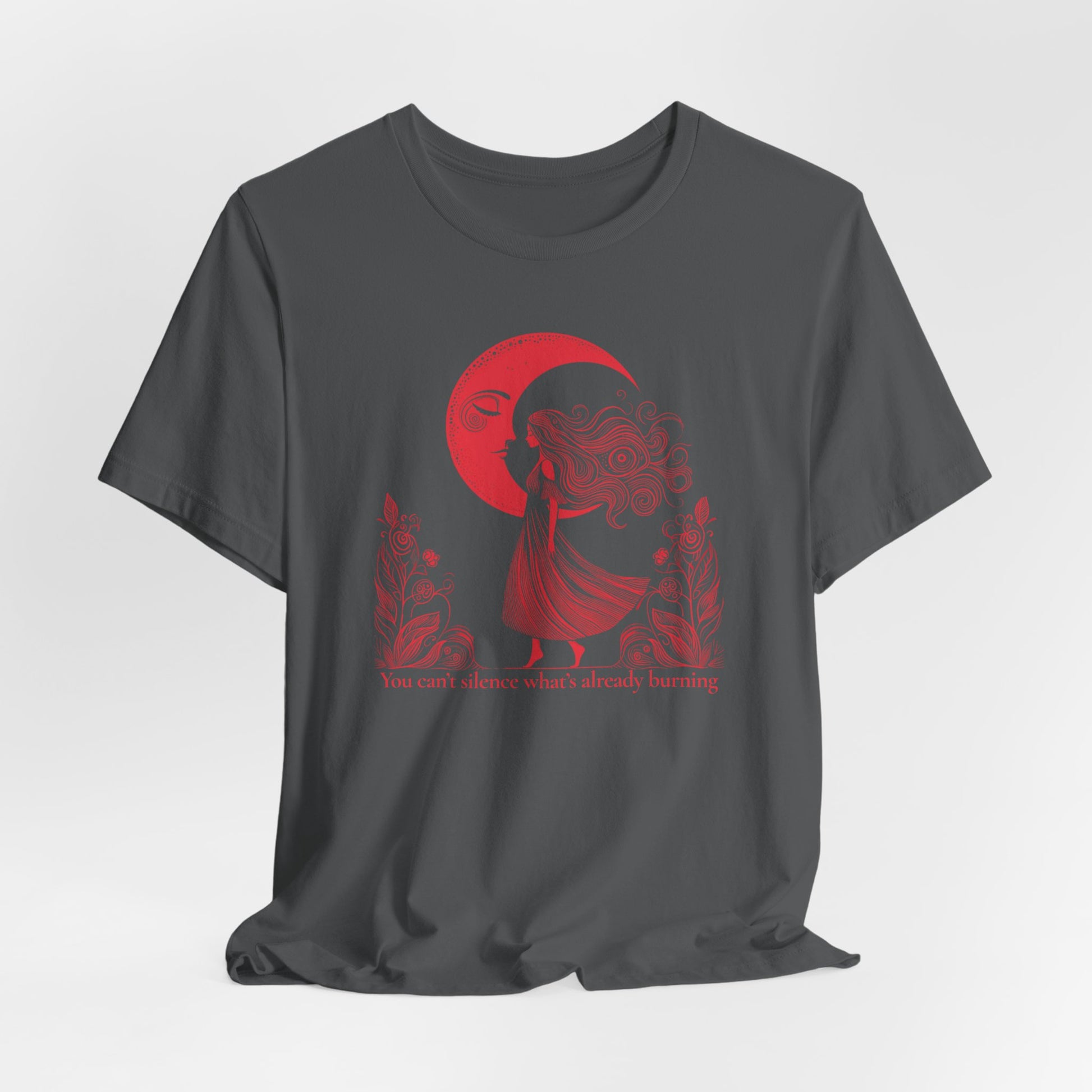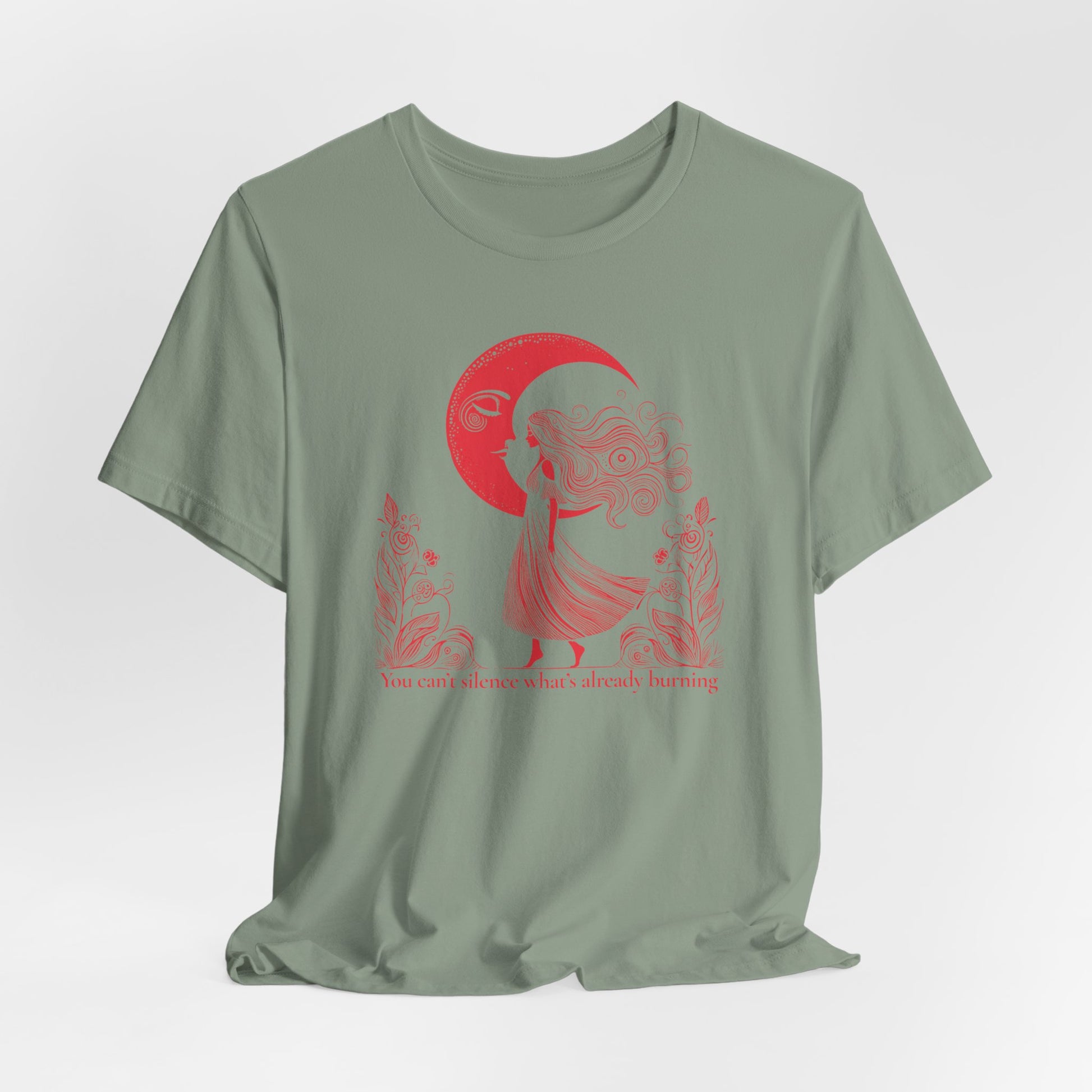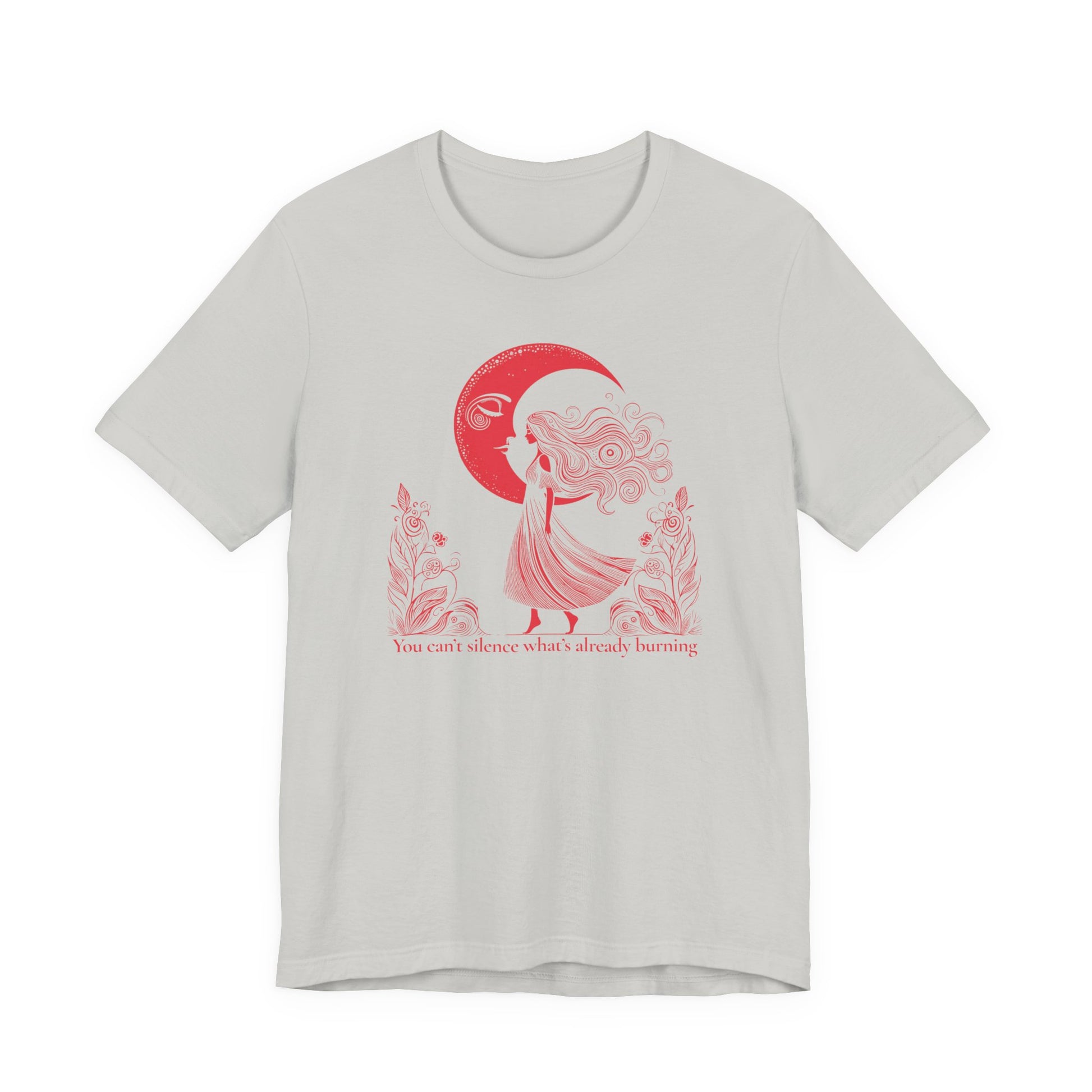 This tee features an original illustration of a woman standing beneath a glowing moon with the words “You can’t silence what’s already burning.” Designed as a soft statement piece that feels strong, expressive, and easy to wear every day.